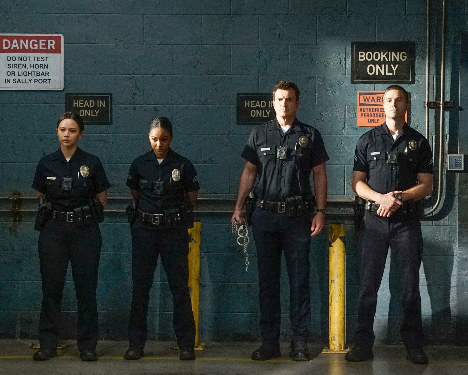 THE ROOKIE - ABC's "The Rookie" stars Richard T. Jones as Sergeant Wade Grey, Alyssa Diaz as Angela Lopez, Nathan Fillion as John Nolan, Eric Winter as Tim Bradford, Melissa O'Neil as Lucy Chen, and Titus Makin Jr. as Jackson West. (ABC/Andrew Eccles)Bild: © Ed Herrera / ABC / American Broadcasting Companies, / RTS/Ed Herrera
