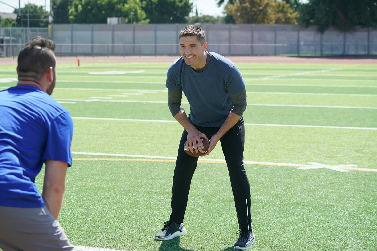 Sicher ist sicherNachdem alle Verbrechen aufgeklärt sind, spielt Tim Brandford (Eric Winter, r.) mit den Watts Rams Football.Bild: © ZDF und Richard Cartwright.