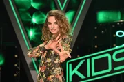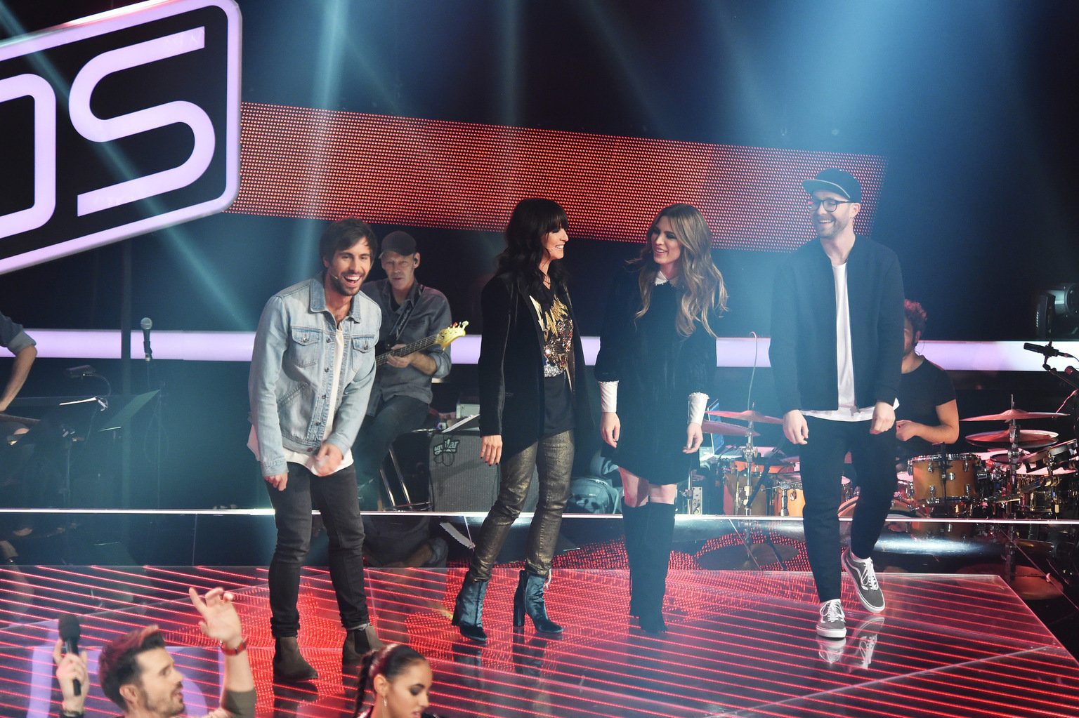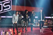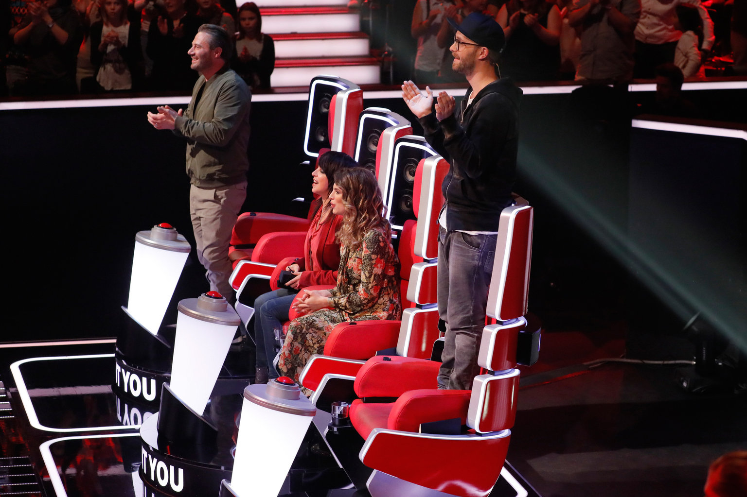 FinaleDie "The Voice Kids"-Bretter, die die Welt für die Coaches bedeuten: (v.l.n.r.) Max Giesinger, Nena, Larissa und Mark Forster geben alles für ihre Teams.Bild: © Sat.1 (DE) /Andre Kowalski / © SAT.1