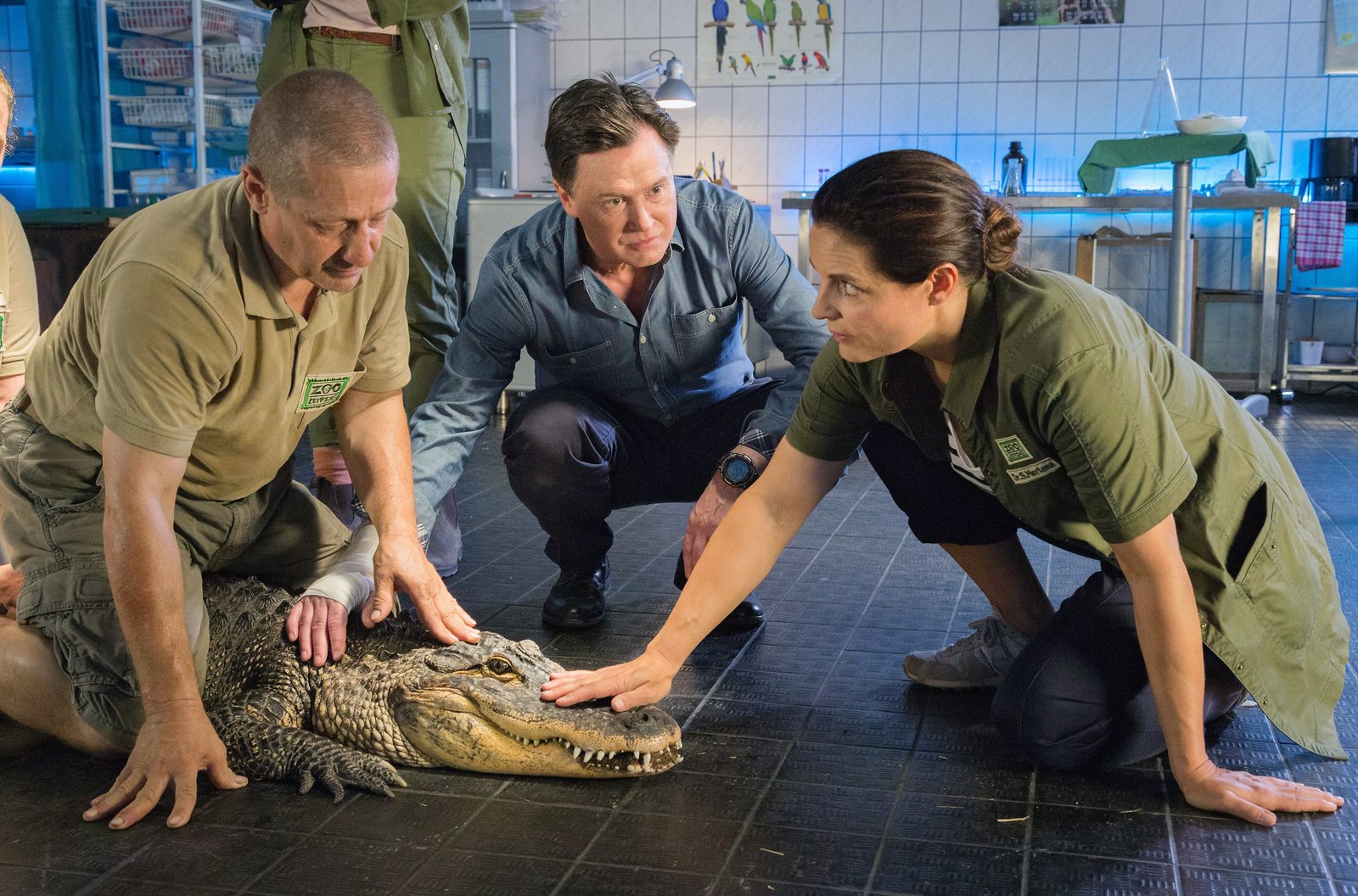 Allgemeine VerunsicherungWolfgang Neubert (Uwe Bohm, M.), Besitzer einer Reptilienshow, will sein Krokodil Nero an den Zoo verkaufen. Er verheimlicht Tierärztin Susanne Mertens (Elisabeth Lanz, r.) allerdings, dass das Tier nicht gesund ist. (Komparse, l.)Bild: © ARD/Steffen Junghans