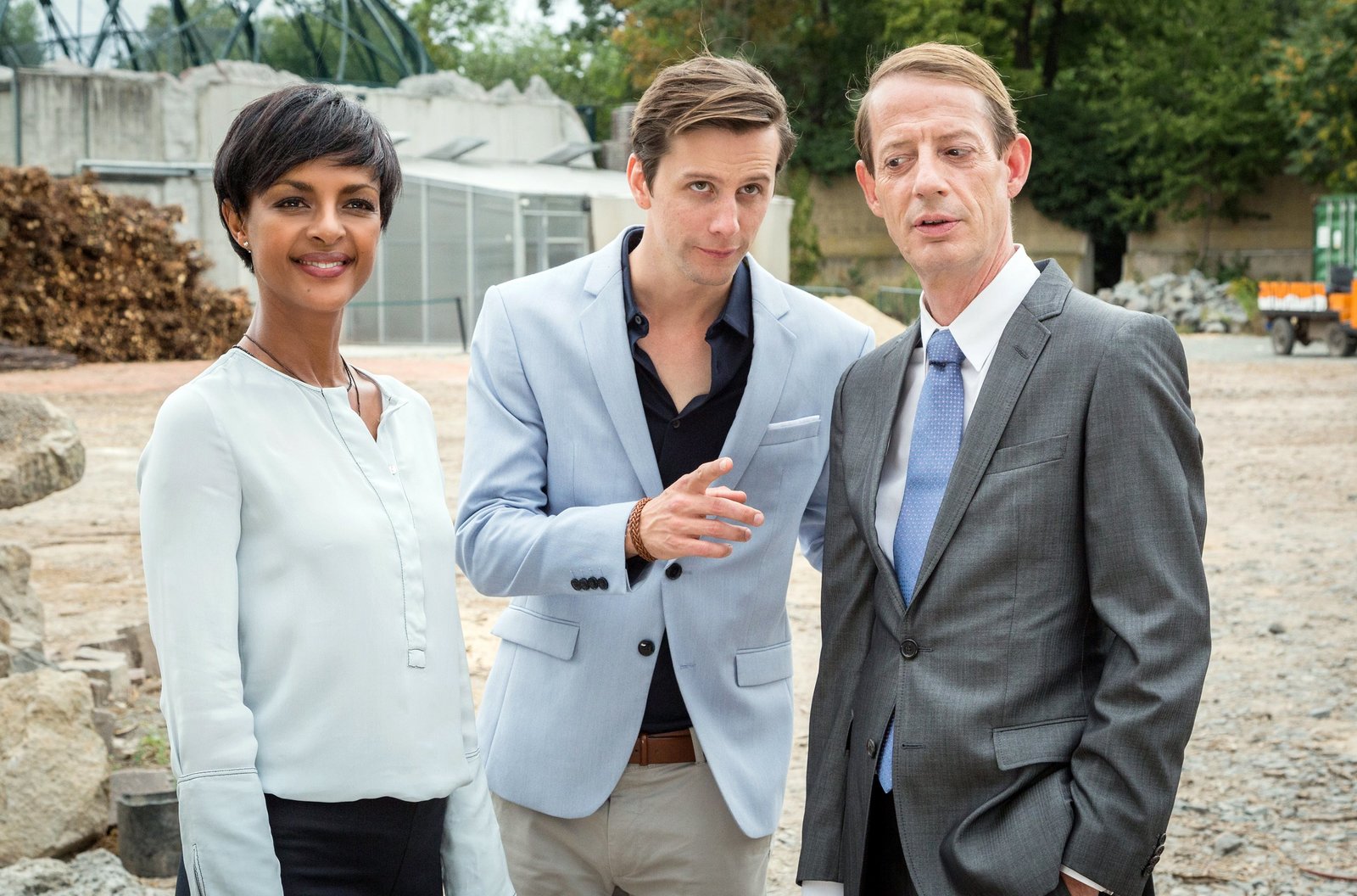 Schmerzhafte EntscheidungZoodirektorin Amal Bekele (Dennenesch Zoudé, l.) erwartet gutgelaunt und siegessicher den Besuch von OB Herrenbrück. Kein Wunder, denn ihr einflußreicher Besucher aus Berlin, Dr. Ludwig, Staatsekretär im Bundesinnenministerium (Luc Feit, r.) wurde von Robert Jansen (Jonathan Beck, M.) in Amals Sinn gut gebrieft.Bild: © ARD/Steffen Junghans