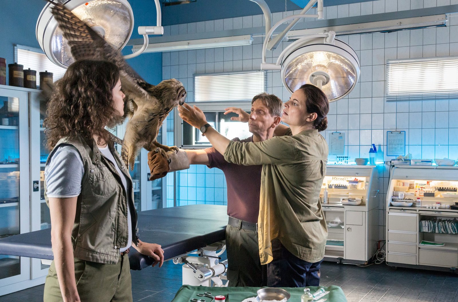 Wege zum GlückDiesem Uhu hat das Team um Tierärztin Susanne Mertens (Elisabeth Lanz, r.) geholfen. Cheftierpfleger Conny (Thorsten Wolf, 2.v.r.) und Assistenzärztin Karoline Schneider (Maxine Kazis, l.) dürfen ihn wieder in die Freiheit entlassen.Bild: © ARD/Steffen Junghans
