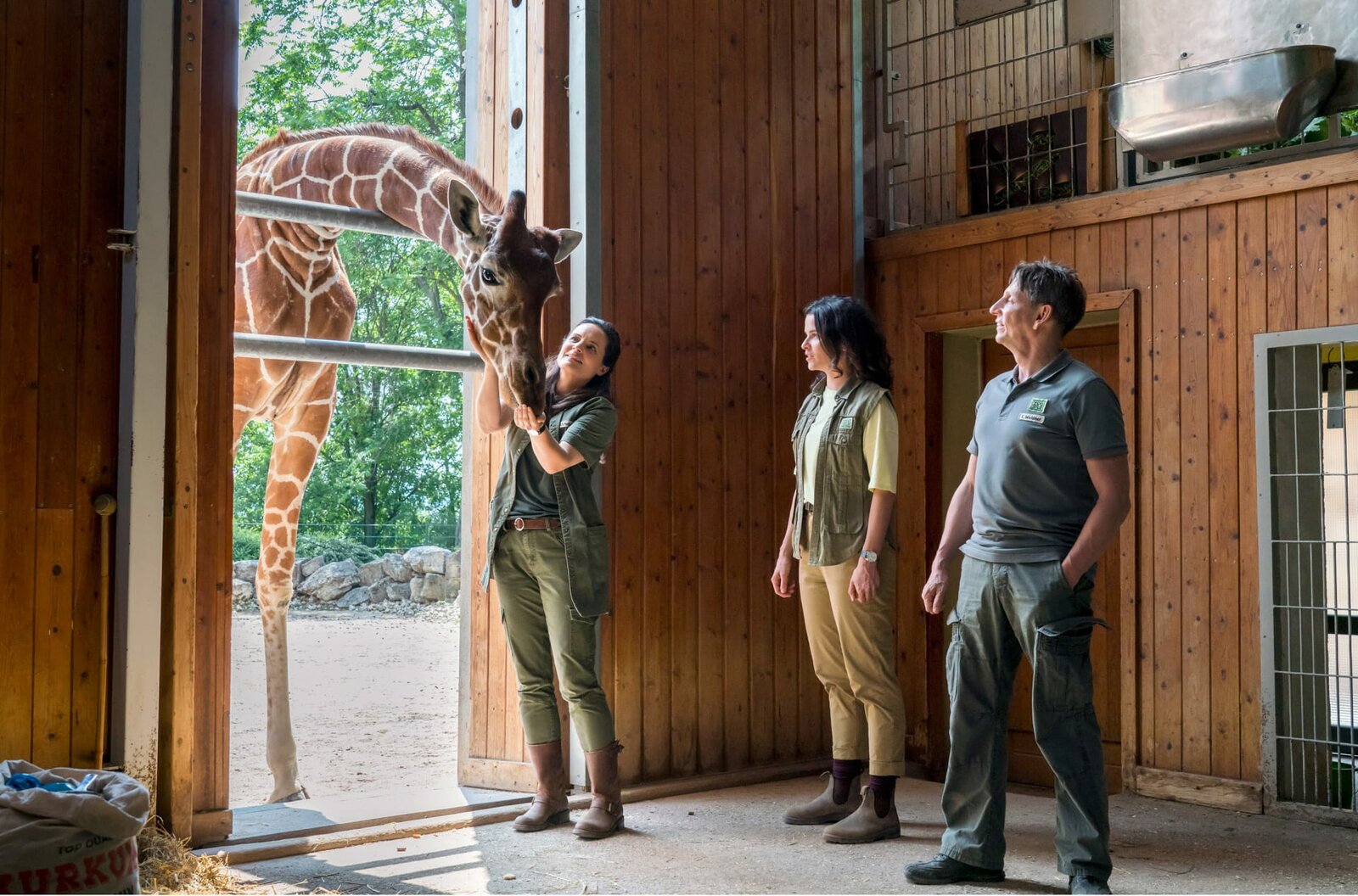 Hoch hinausPanik unter den Tieren auf der Savanne: Giraffenbulle Hugo erleidet einen heftigen Arthritisschub. Das macht dem Team um Dr. Susanne Mertens (Elisabeth Lanz,, l.) ihrer Kollegin Karoline Schneider (Maxine Kazis, M.) und Cheftierpfleger Conny Weidner (Thorsten Wolf, r.) große Sorgen.Bild: © ARD/Steffen Junghans