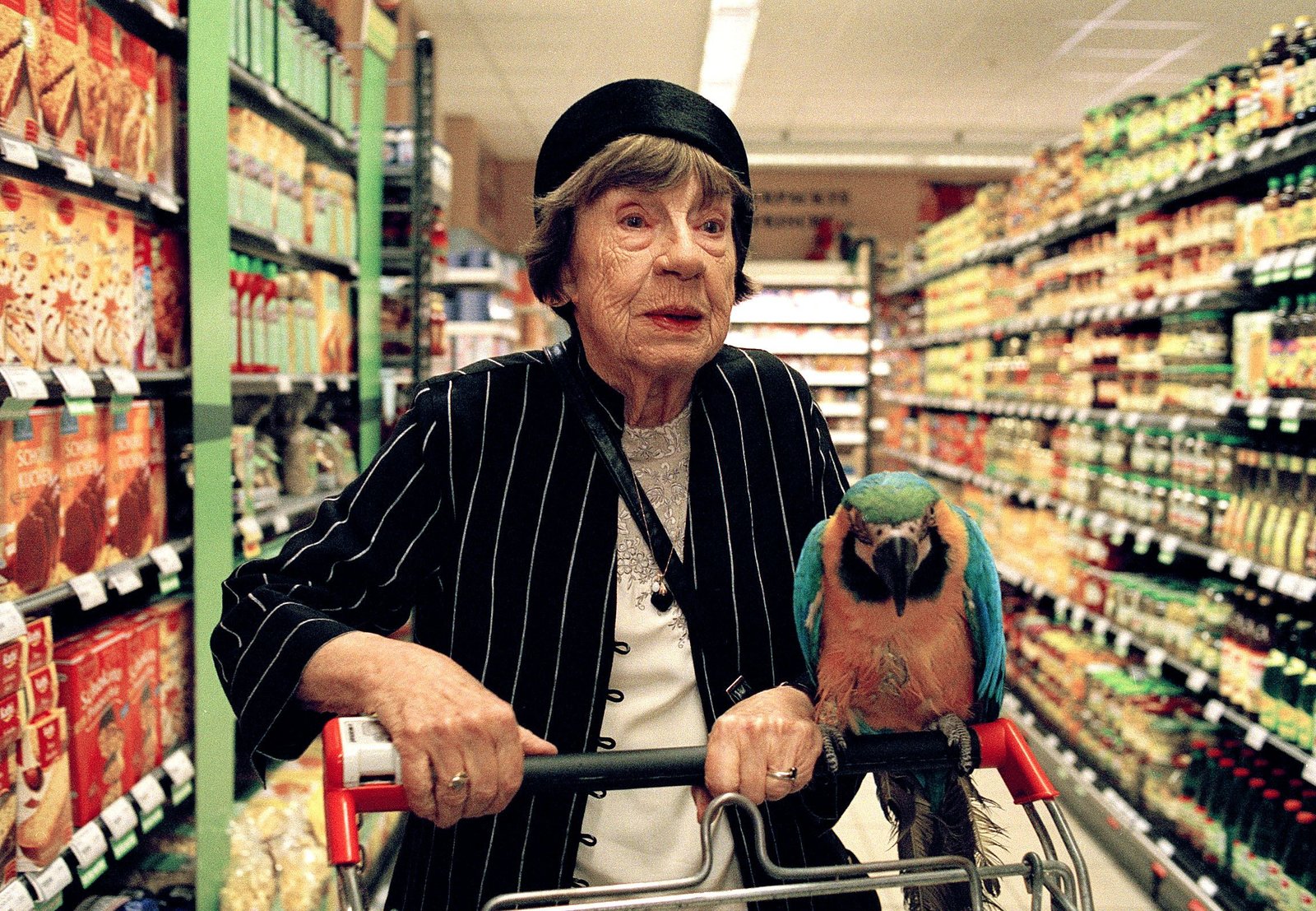 Die UnzertrennlichenKlara Schuster (Christel Peters) hat die Papageien-Dame Lora aus dem Zoo entführt und sucht mit ihr im Supermarkt nach geeignetem Futter.Bild: © ARD/BR/Christa Köfer