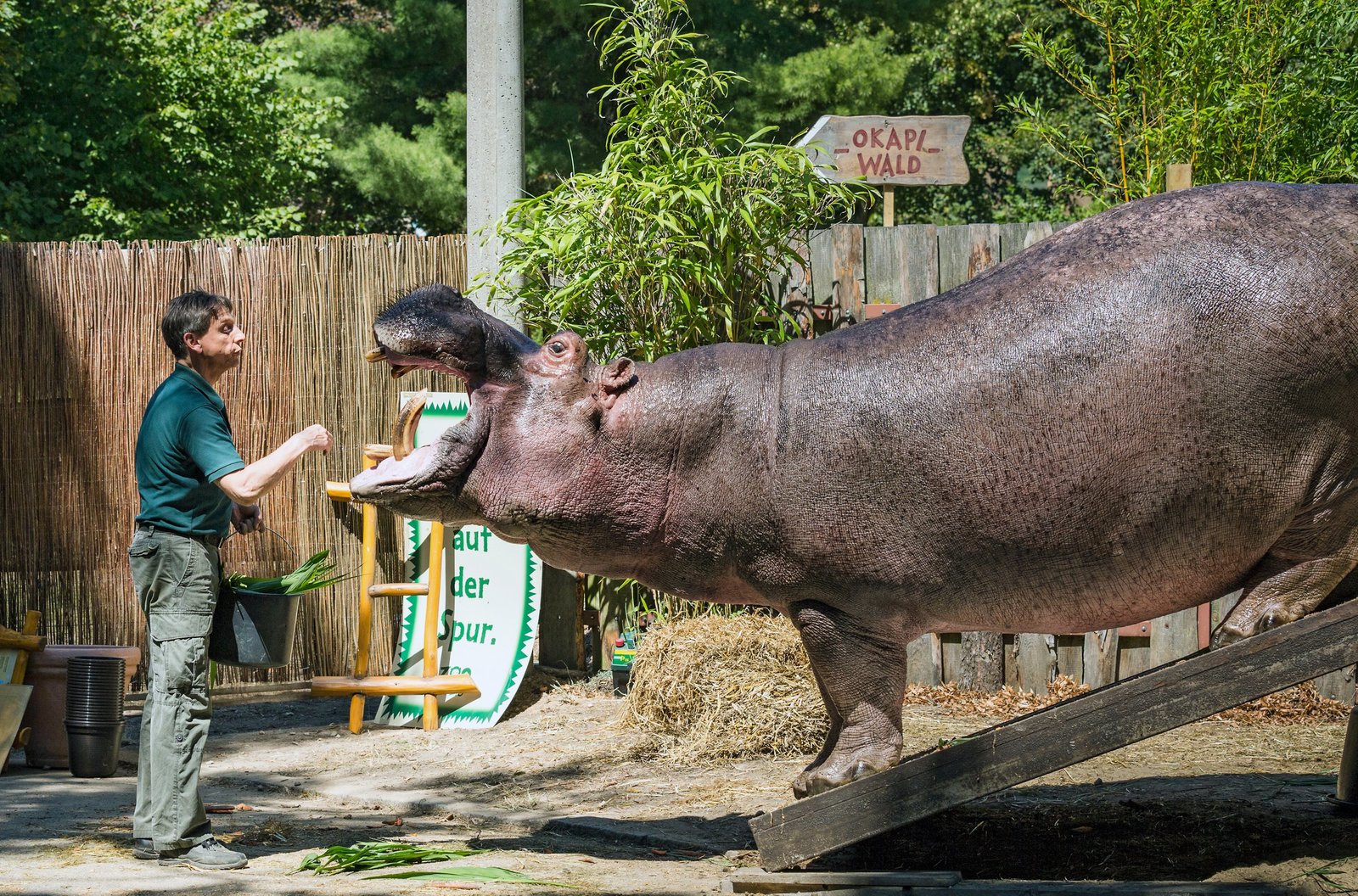 Ein unwiderstehliches AngebotCheftierpfleger Conny (Thorsten Wolf) kennt seine Tiere. Mit gutem Zureden und dem richtigen Fressen kann man auch ein krankes widerspenstiges Flusspferd aus dem Wasser lockenBild: © ARD/Steffen Junghans