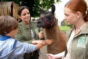 Vor der HochzeitLama Horst als Therapeut. Dr. Susanne Mertens (Elisabeth Lanz, M.) und ihre Assistentin Anett (Anna Bertheau, r.) hoffen, dass die Begegnung mit dem Tier dem traumatisierten David (Max Schmuckert, l.) helfen wird.Bild: © MDR/Christa Köfer