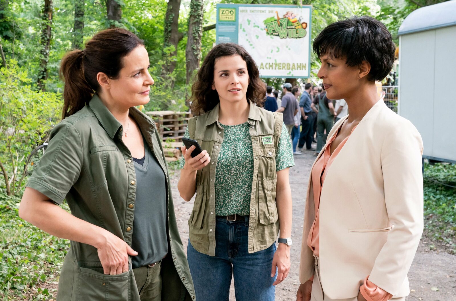 Große EntscheidungenZoodirektorin Amal Bekele (Dennenesch Zoudé, r.) hat die Belegschaft informiert, dass sie die Achterbahn nicht bauen wird. Tierärztin Dr. Susanne Mertens (Elisabeth Lanz, l.) und ihre Kollegin Karoline (Maxine Kazis, M.) freuen sich über diese mutige Entscheidung.Bild: © ARD/Steffen Junghans