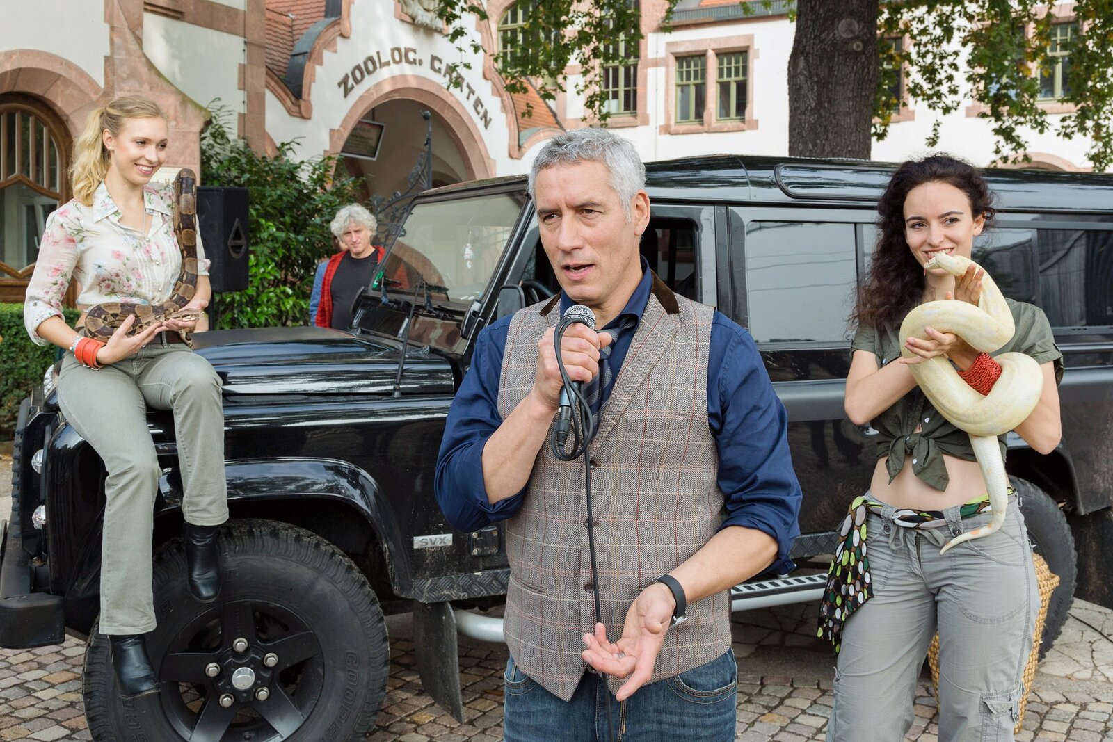 Neue UferTierärztin Susanne Mertens hält einen wichtigen Vortrag. Im Zoo wird sie gern und kompetent von Assistenzärztin Karoline Schneider (Maxine Kazis, l.), Papa Professor Baumgart (Gunter Schoß, M.) und Cheftierpfleger Conny (Thorsten Wolf, r.) vertreten.Bild: © ARD/Steffen Junghans