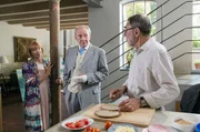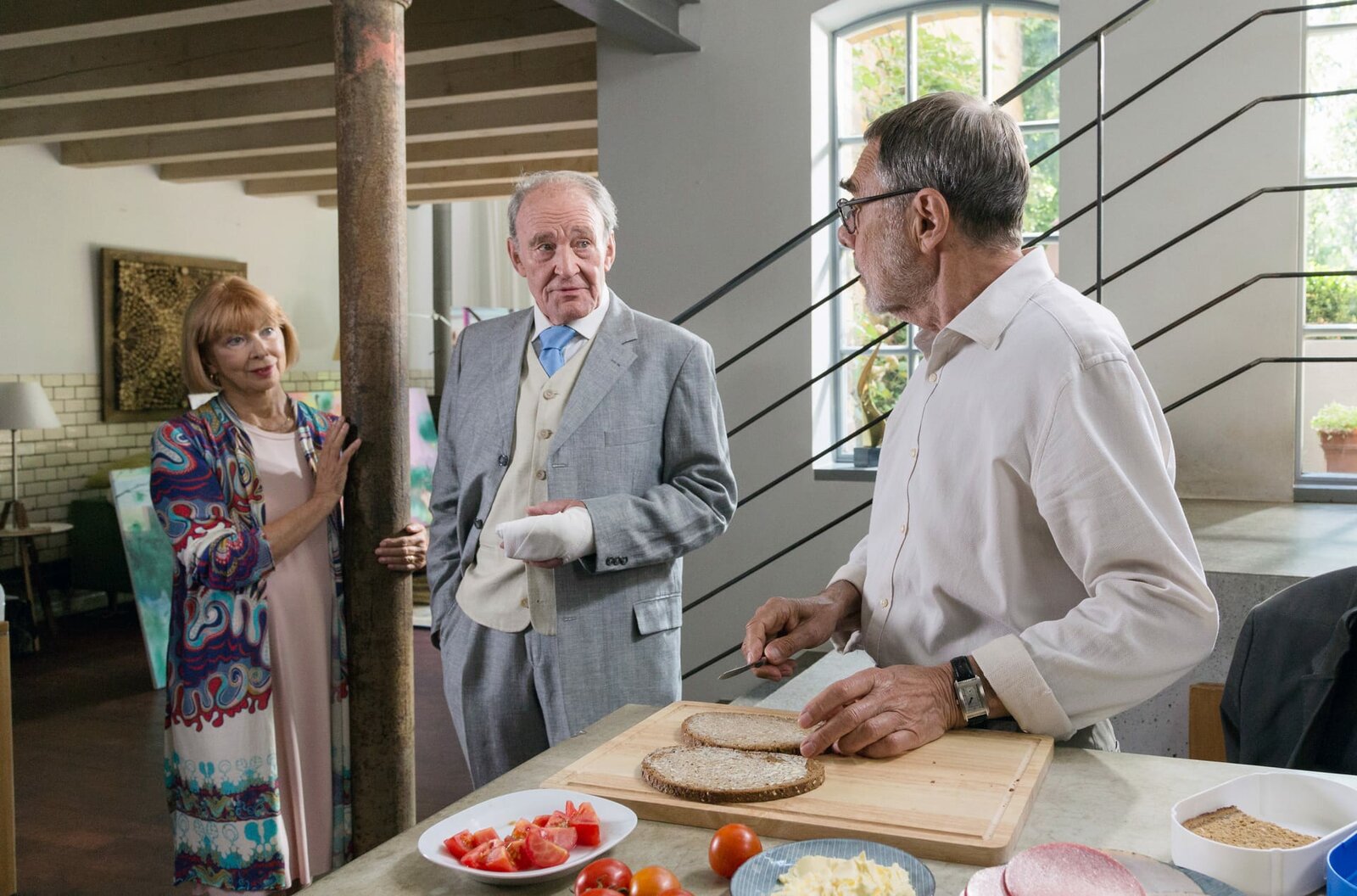 Ein unwiderstehliches AngebotGalerist Dietrich Kramer (Michael Mendl, M.) lobt Charlottes (Ursela Monn, l.) Gemälde überschwänglich. Charlotte freut sich, Georg (Gunter Schoß, r.) ist skeptisch. Er mag den alten Schulfreund von Charlotte nicht und traut ihm nicht über den Weg.Bild: © ARD/Steffen Junghans