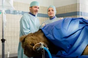 Die RealistinDr. Gregersen (Tobias Hoesl, l.) und Tierärztin Dr. Mertens (Elisabeth Lanz, r.) haben dem Braunbären Osmo erfolgreich Gold implantieren und so das Leben des Tieres retten können.Bild: © ARD/Steffen Junghans
