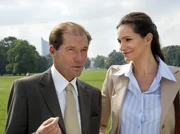 Das Haifischbecken15 Uhr im Ersten. Dr. Fährmann (Michael Lesch, l.) führt die Staatssekretärin Dr. Weingarten (Alexandra Kamp, r.) auf die Wiese, auf der die Tropenhalle gebaut werden soll.Bild: © rbb