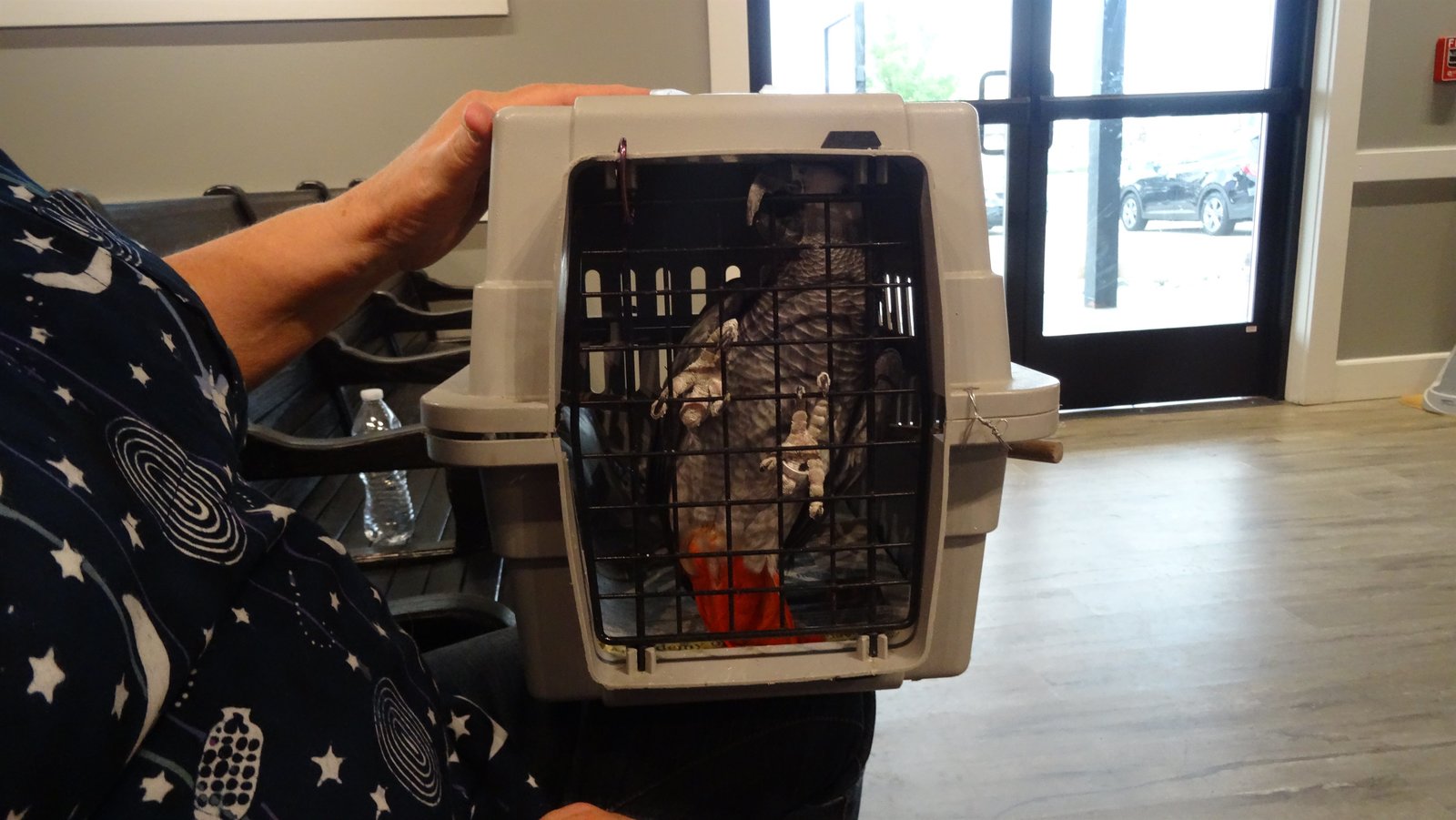 Cyclone the Parrot is in the waiting room with the owner.