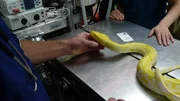A banana snake on the table in the vet.