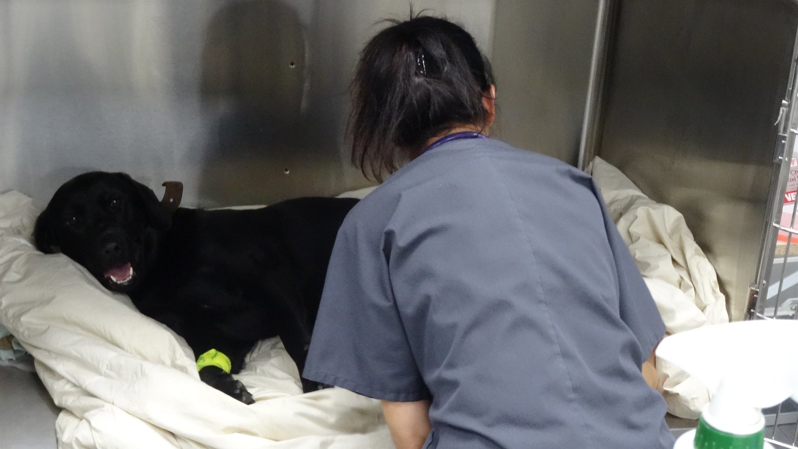 Shelly taking Karla out of the kennel in the OR to be prepped for surgery.