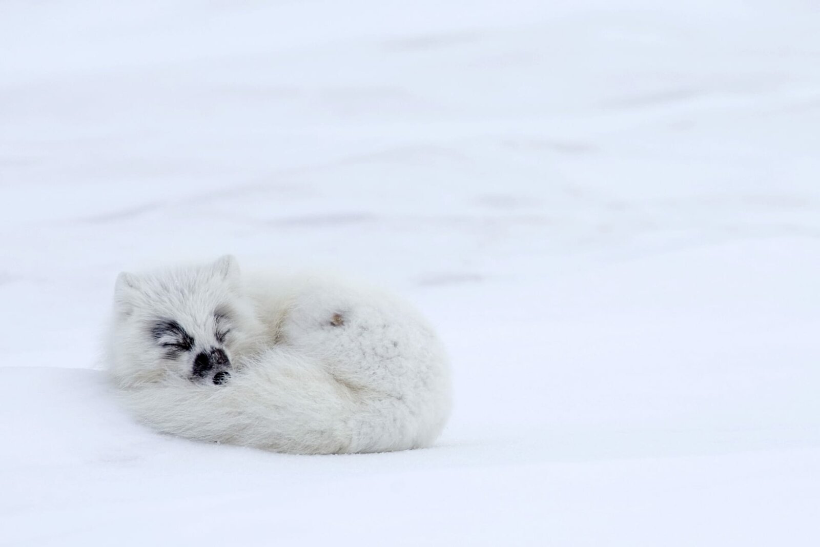 Kleine liebenswerte AlaskanerDen Schwanz über die Augen und Abwarten, der Eisfuchs trotzt den Winterstürmen.Bild: © BR/Ernst Arendt/Hans Schweiger/Ernst Arendt;Hans Schweiger