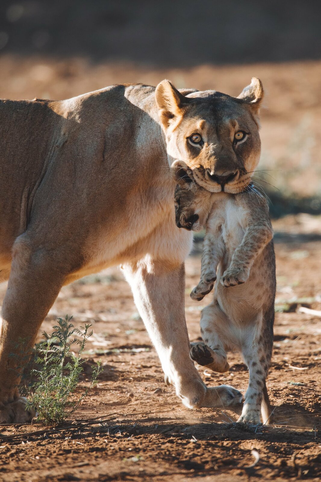 Chinga, die LöwinLöwin trägt ihr Welpe.Bild: © ZDF und Russ MacLaughlin.