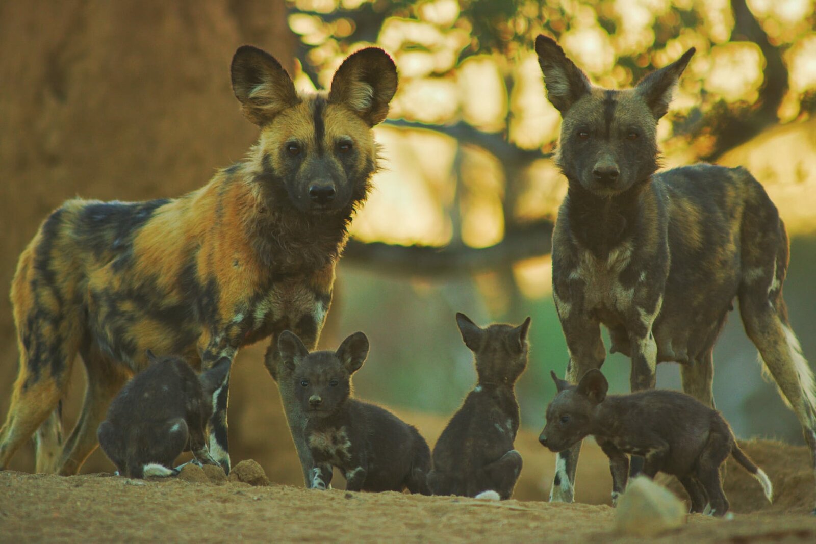 Lyca, die WildhündinZeema das Alphaweibchen mit ihren Kindern. Wegen ihres marmorierten Fells werden sie auch „bunte“ oder „bemalte“ Wölfe genannt.Bild: © ZDF und Russ MacLaughlin.