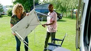 Mit Yared Dibaba auf der Insel PoelModeratorin Bettina Tietjen wird beim Aufbau der Campingmöbel von Yared Dibaba unterstützt. (Bild: © NDR/beckground tv/Marvin Vehring