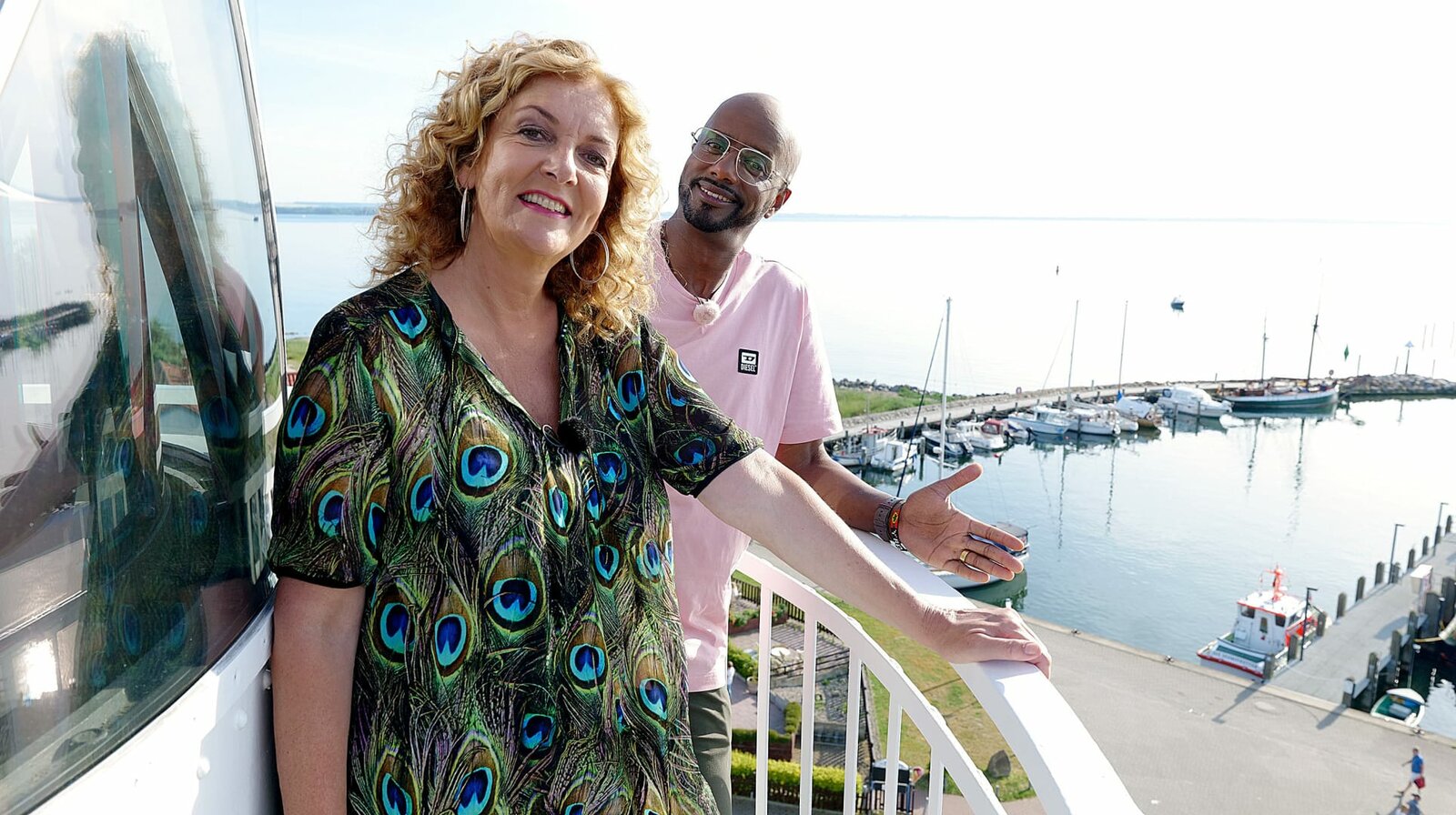 Mit Yared Dibaba auf der Insel PoelBettina Tietjen und Yared Dibaba hoch oben auf dem Leuchtturm der Insel Poel. (Bild: © NDR/beckground tv/Marvin Vehring
