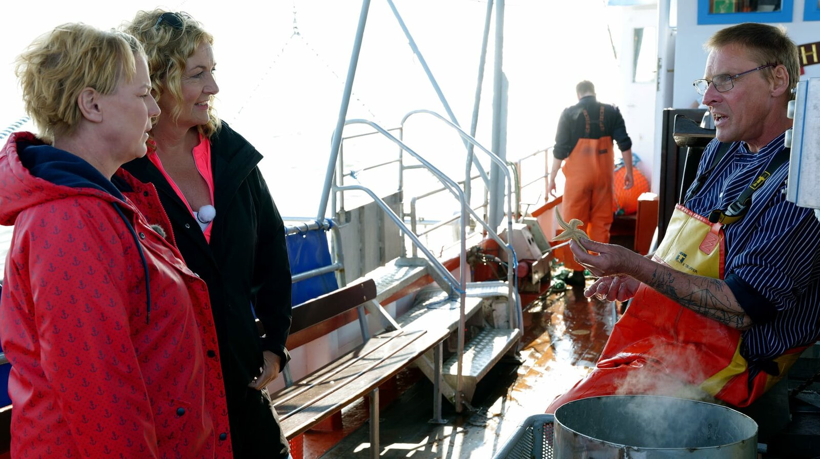 Mit Mirja Boes in BüsumBettina Tietjen und Mirja Boes lassen sich von einem Krabbenfischer den Beifang erkla?ren. (Bild: © NDR/beckground tv/Marvin Vehring