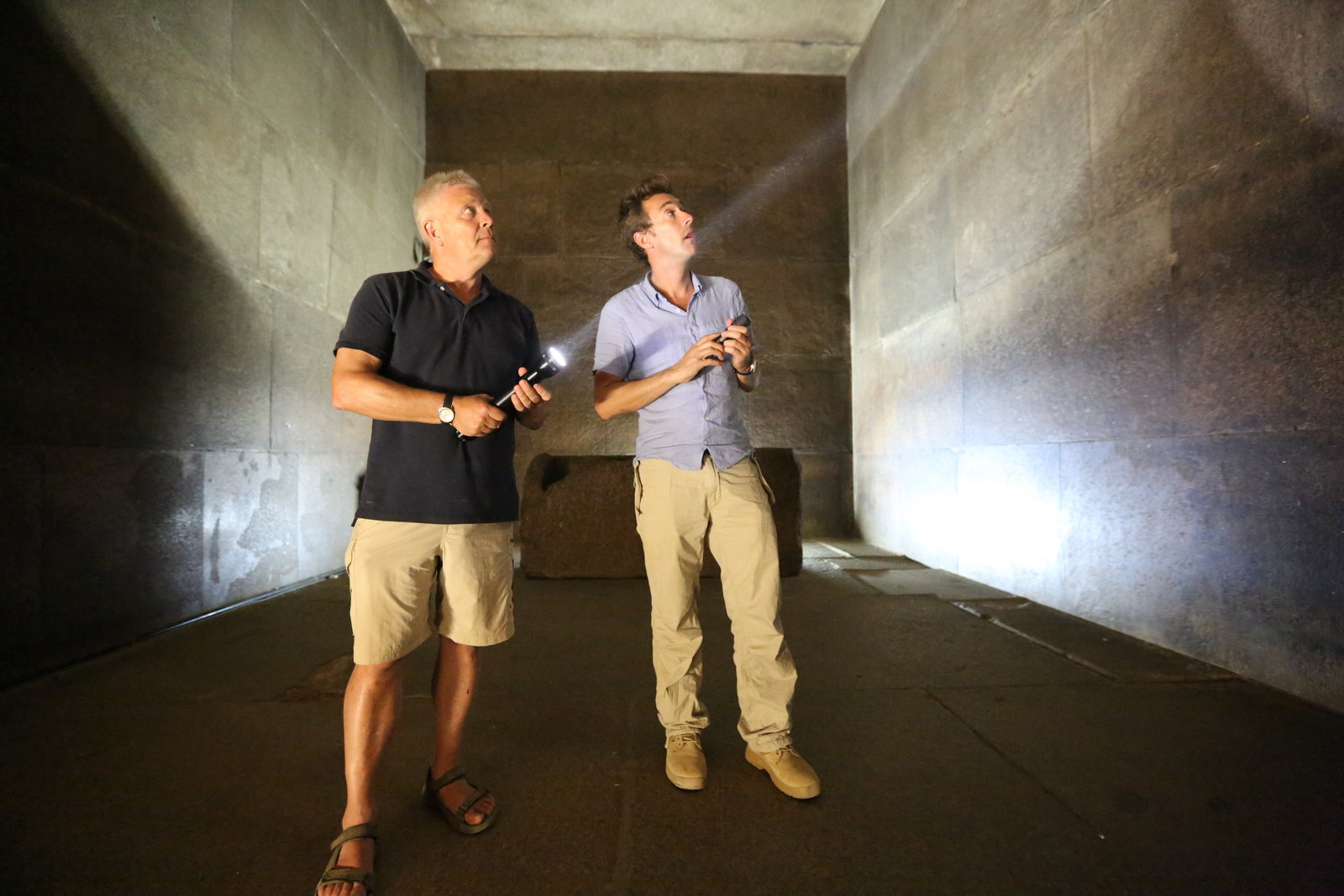 PyramidenSteve Burrows und Dallas Campbell untersuchen die Königskammer in der großen Pyramide von Gizeh.Bild: © ZDF und Alex Rowson