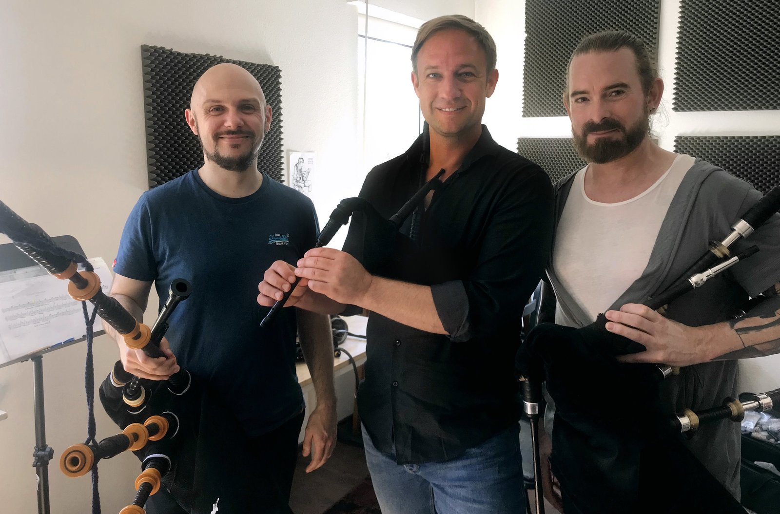 Hofheim am Taunus hautnah!Tobi Kämmerer (Mitte) mit dem Dudelsack-Lehrer Thomas Zöller (links) und dem Schüler Martin Löwen-Mörsdorf in der Dudelsack-Akademie.Bild: © BR/HR/Johanna Mihm