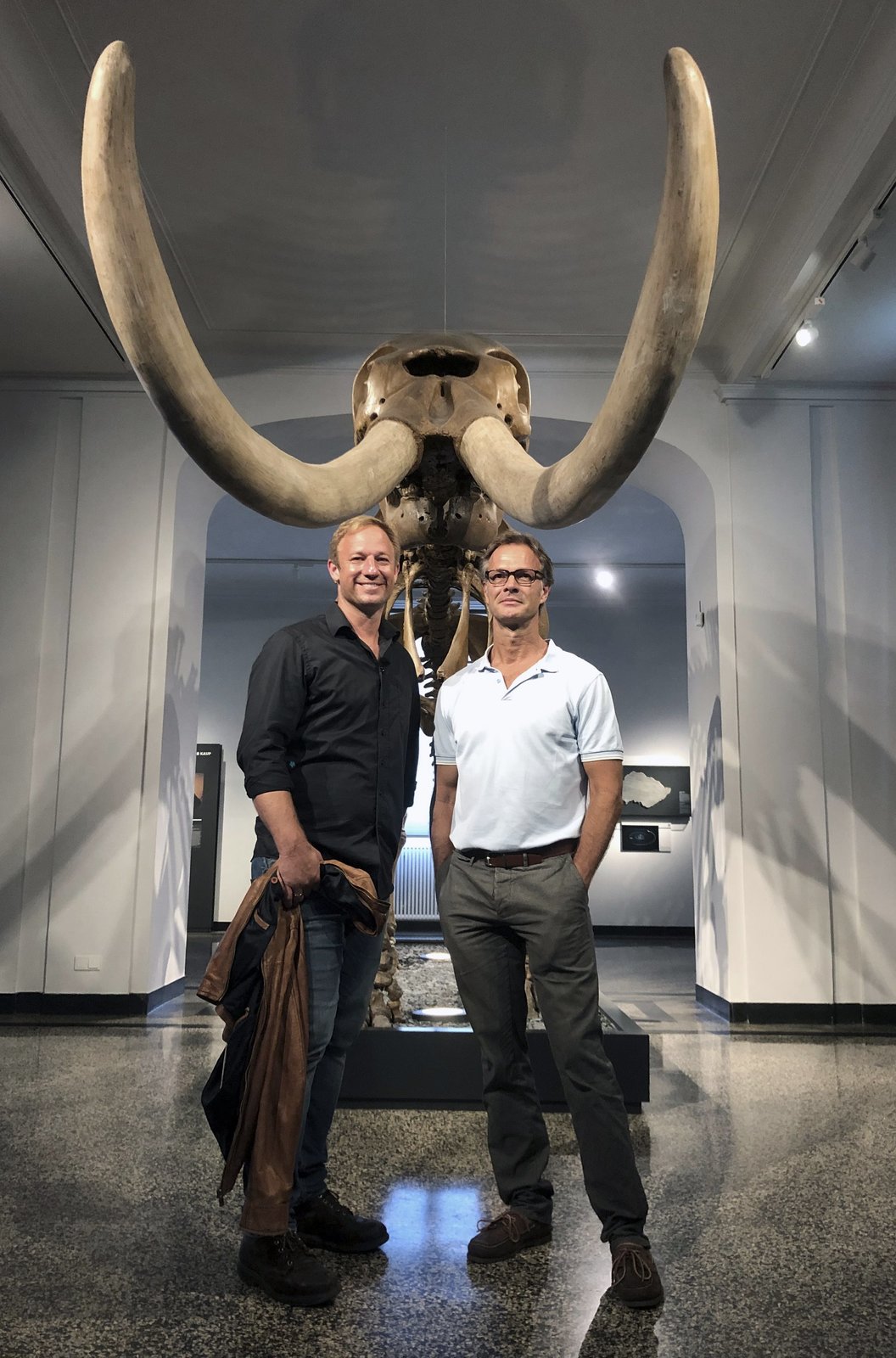Tobi Kämmerer mit dem Kurator Oliver Sandrock im Hessischen Landesmuseum vor einem Mastodon-Skelett.Bild: © HR/Friso Richter