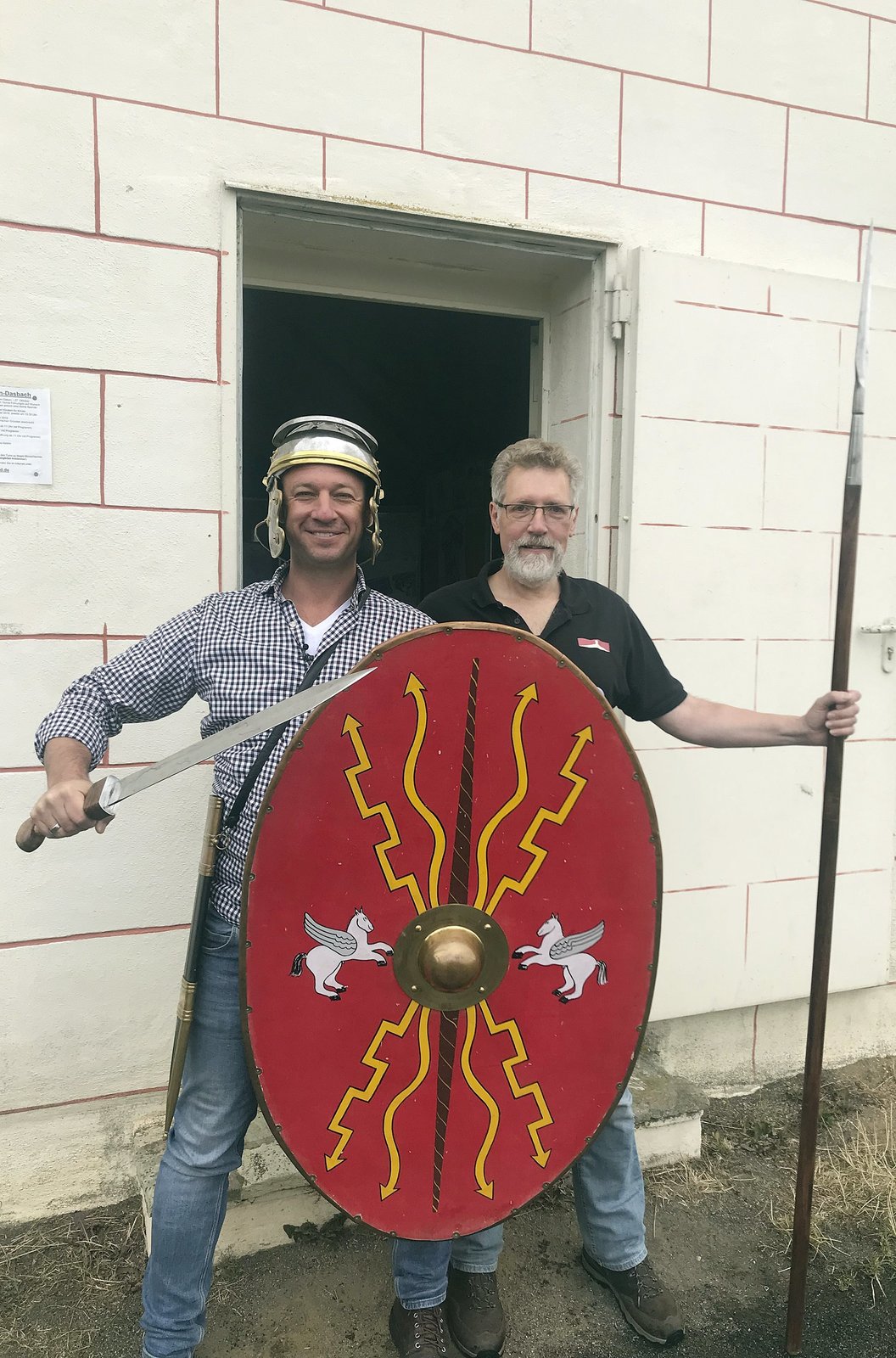 Idstein hautnah!Tobias Kämmerer (links) mit Frank Thielmann vom Freundeskreis Limes im Idsteiner Land vor dem Limesturm.Bild: © HR/Johanna Mihm