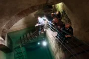 Friedberg hautnah!Tobi Kämmerer (2.v.r.) mit Gisela Kosel (rechts), Mitarbeiterin des Wetterau-Museums in Friedberg, und seinem Filmteam in der Friedberger Mikwe; dieses Judenbad ist die größte vollständig und eine der wenigen überhaupt erhaltenen mittelalterlichen Groß-Mikwen in Deutschland.Bild: © HR/Friso Richter