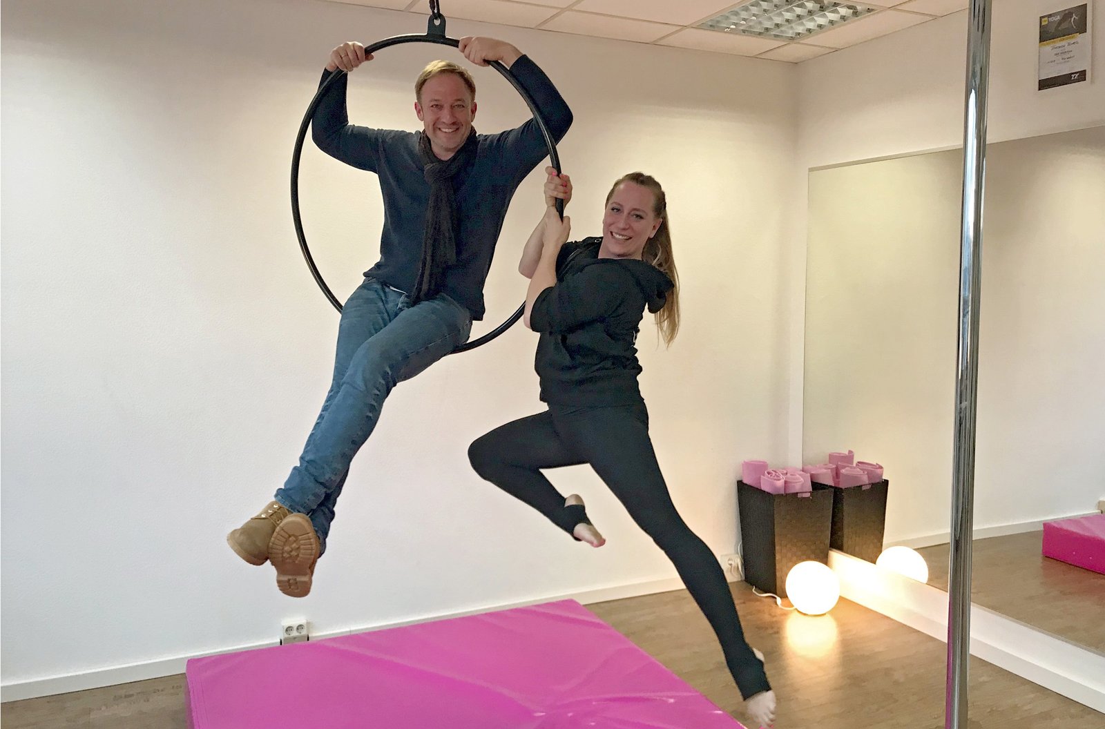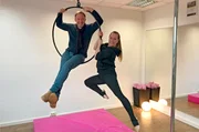 Bad Homburg hautnah!Tobi Kämmerer mit Theresa Theves in ihrem Pole-Dance-Studio in Bad Homburg beim „Aerial Hoop“.Bild: © HR/Johanna Mihm