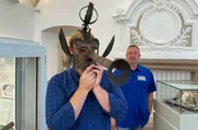 Weilburg hautnah!Tobi in einer Schandmaske mit Holger Redling im Bergbau- und Stadtmuseum Weilburg.Bild: © HR/Friso Richter