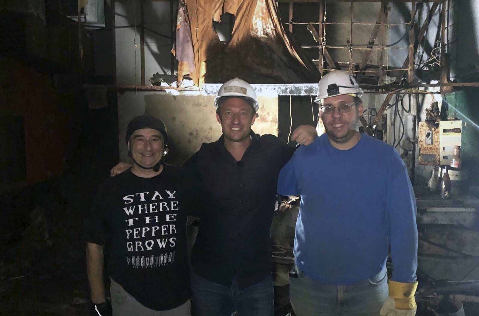 Tobi Kämmerer (Mitte) mit Mathias Zeidler (links) und Nils Springer von der „Interessengemeinschaft Unterwelt“ in einer verlassenen Darmstädter Diskothek.Bild: © HR/Lukas Lowack