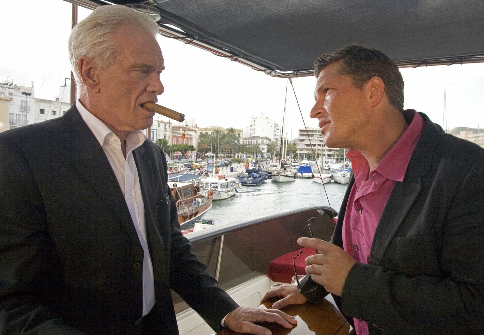 Der rote RegenARD TONI COSTA - KOMMISSAR AUF IBIZA: DER ROTE REGEN, Deutschland 2011, Regie Michael Kreindl, am Samstag (13.06.15) um 21:45 Uhr im Ersten. "El Cubano" (Burkhard Driest, li.) besticht den Polizisten Bischof (Antonio Putignano).Bild: © ARD Degeto/Renko Bruhn