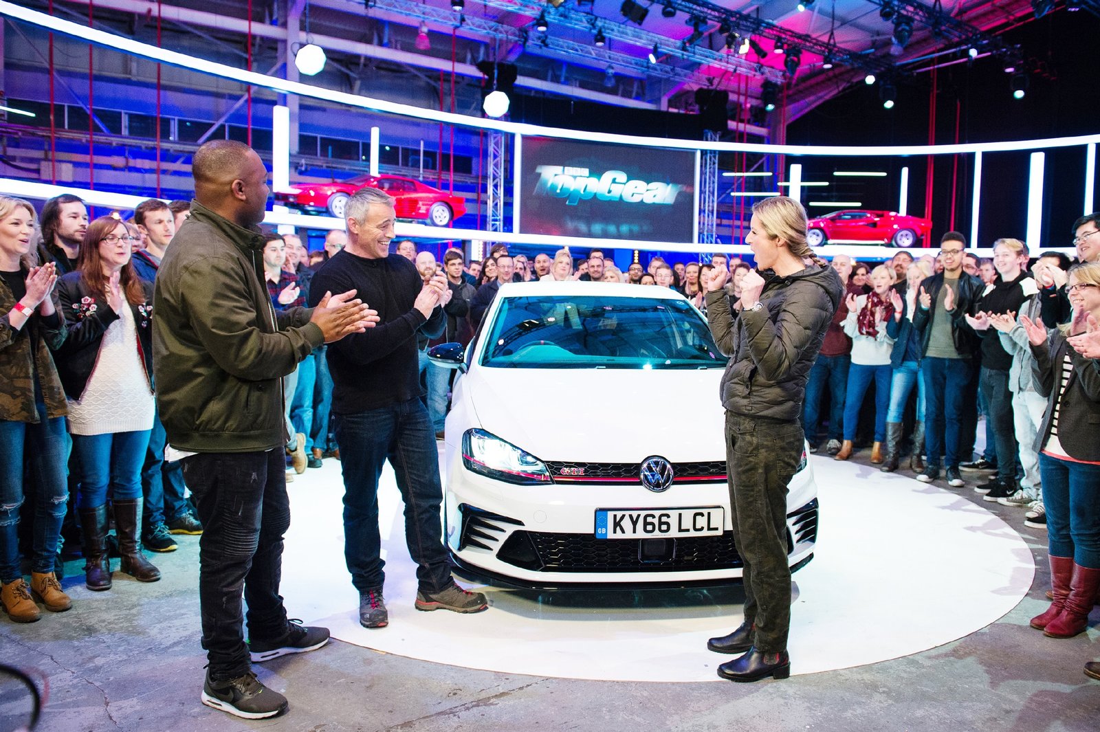 Series 24, Episode 3Vorne v.l.: Rory Reid, Matt LeBlanc und Sabine Schmitz mit einem Volkswagen Golf GTI Clubsport S im Top Gear Studio.Bild: © MG RTL D / BBC 2017