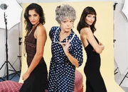 Frau Iseli mit den beiden Ex-Missen: Ex-Miss-Schweiz Bianca Sissing, Birgit Steinegger als Frau Iseli, Ex-Miss-Schweiz Anita BuriBild: © SRF/Heinz Stucki