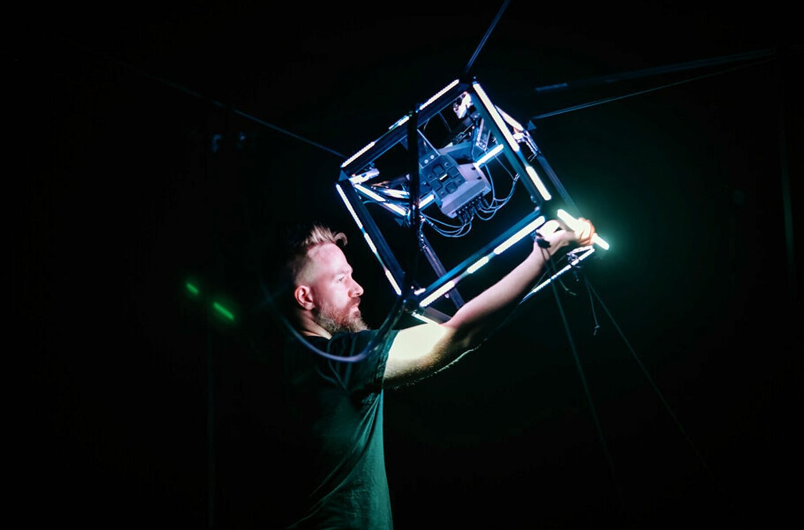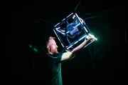Mit umgebauten alten oder neuen Instrumenten verwandelt Alexis Langevin in seinen interaktiven audiovisuellen Performances Bewegung in abstrakte Klänge und Lichtspiele.Bild: © Myriam Ménard