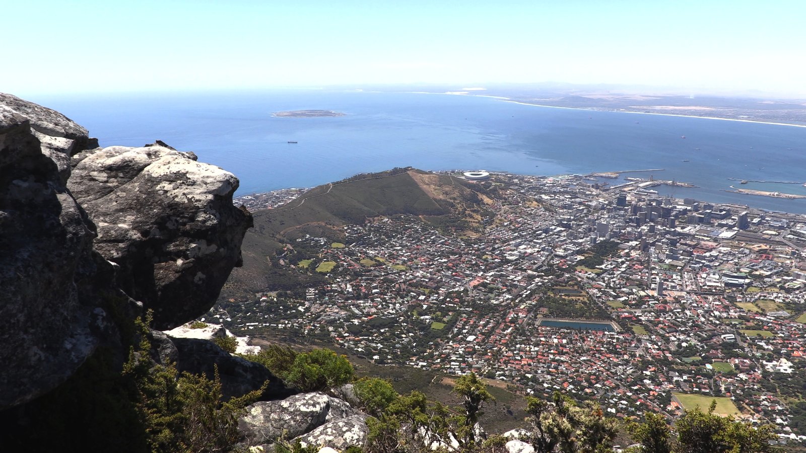 KapstadtBlick vom Tafelberg (1087 m) auf Kapstadt. In der Bucht liegt die Gefängnisinsel Robben Island. Dort hat Nelson Mandela fast zwei Jahrzehnte als Häftling in einer vier Quadratmeter großen Einzelzelle verbracht.Bild: © ZDF und Jean-Marc Dauphin