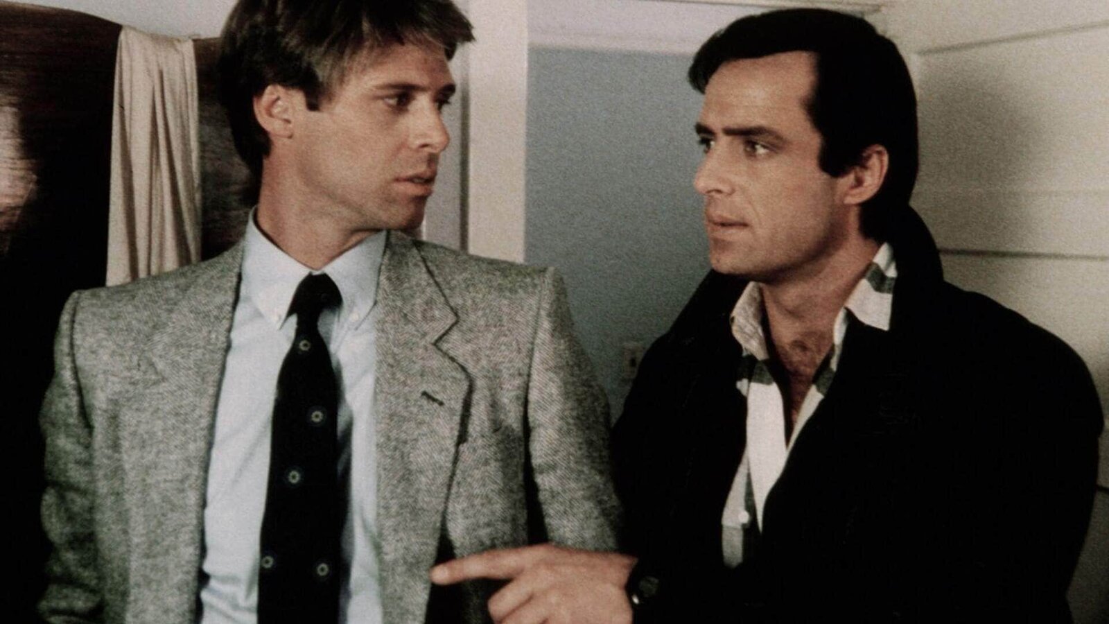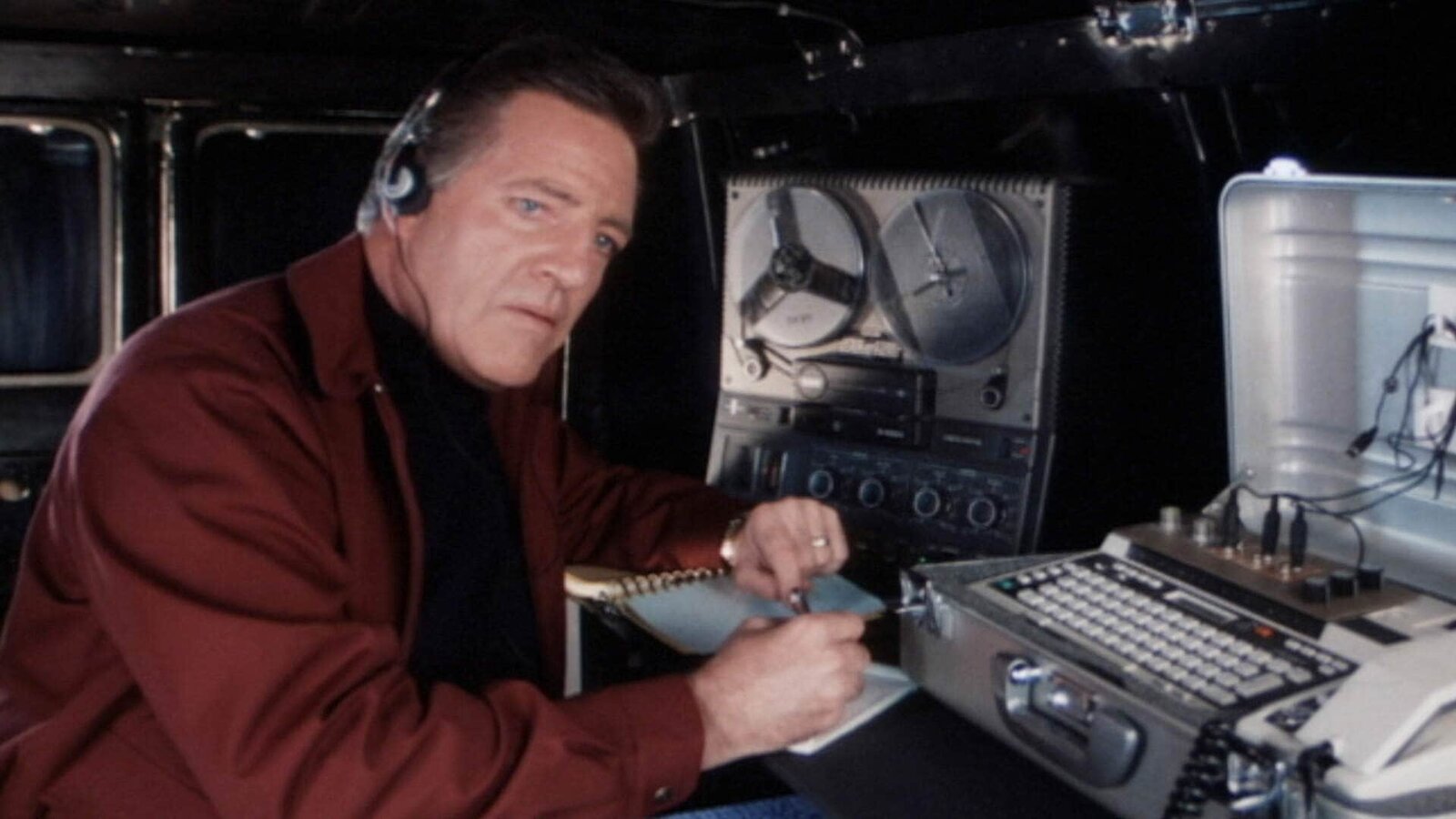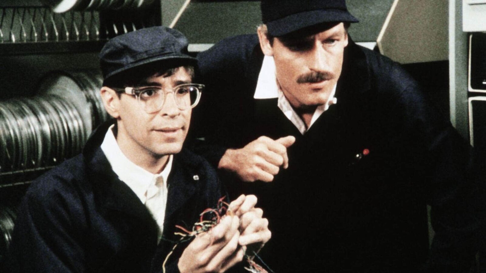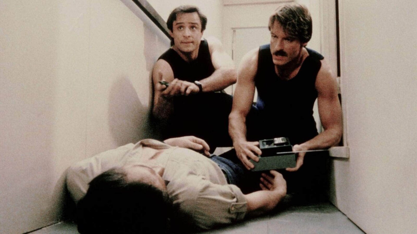 Auf Mord programmiertMurray (Thom Bray, li) und Cody (Perry King) geben sich als Fernmelde-Monteure aus und zapfen die Leitung der Bank an.Bild: © RTL Crime