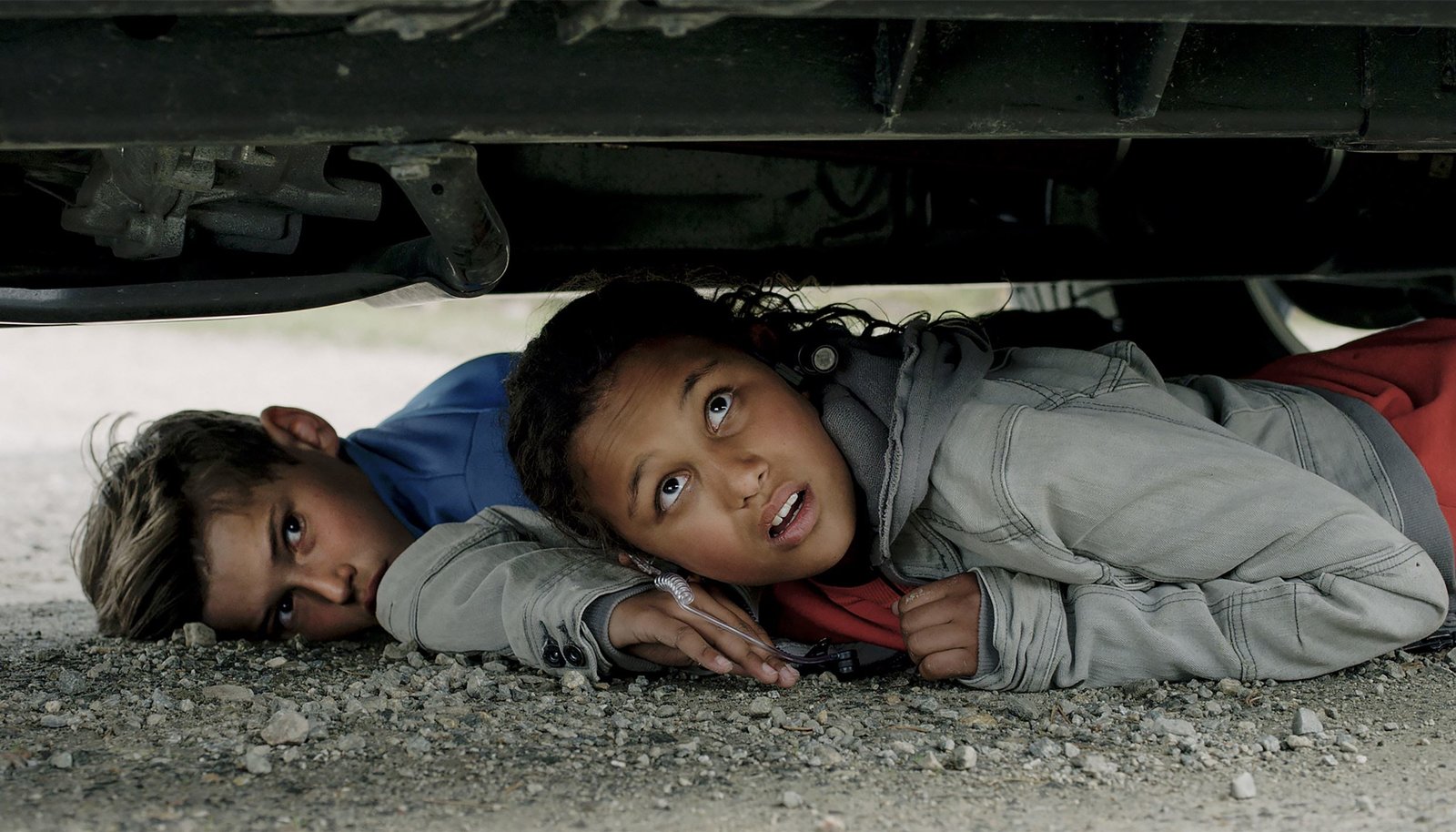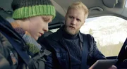 Die Spur der SteineNora (Naomi Hasselberg Thorsrud) und Simon (Oskar Lindquist) verstecken sich unter Tom und Julias Geländewagen.Bild: © NDR/NordicStories