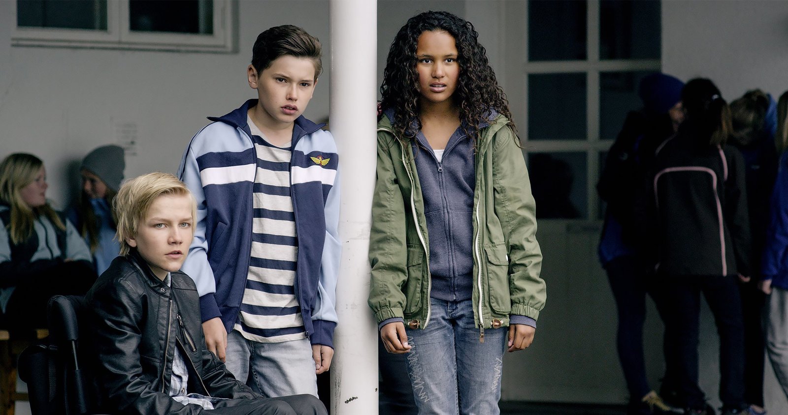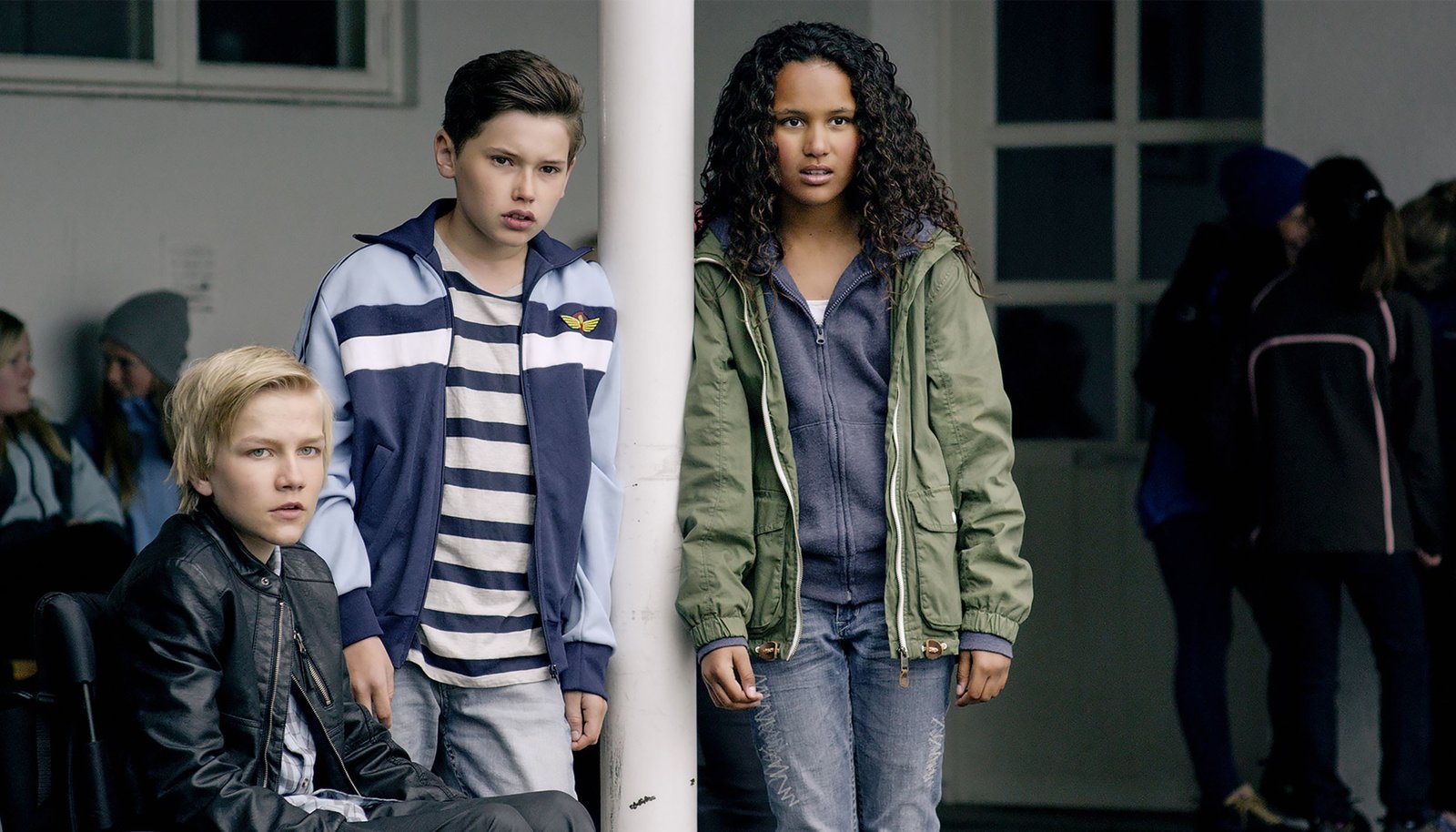 BlutsbrüderLars (Bjørnar Lysfoss Hagesveen), Simon (Oskar Lindquist) und Nora (Naomi Hasselberg Thorsrud) beobachten das Geschehen auf dem Schulhof.Bild: © NDR/NordicStories
