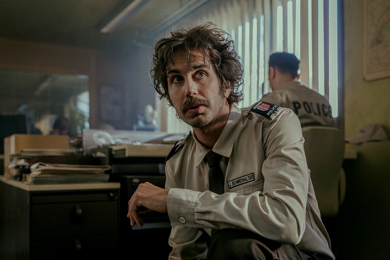 SmetterlingTschugger Staffel 1 Shining Film AG Rafael Kistler Johannes Bachmann, Arnold B. Bucher, David Constantin, Rafael Kistler, Leandro Russo, Mats Frey 2021 Folge 1 Hauptmotiv 4 David Constantin als Bax SRF/Dominic SteinmannBild: © SRF2