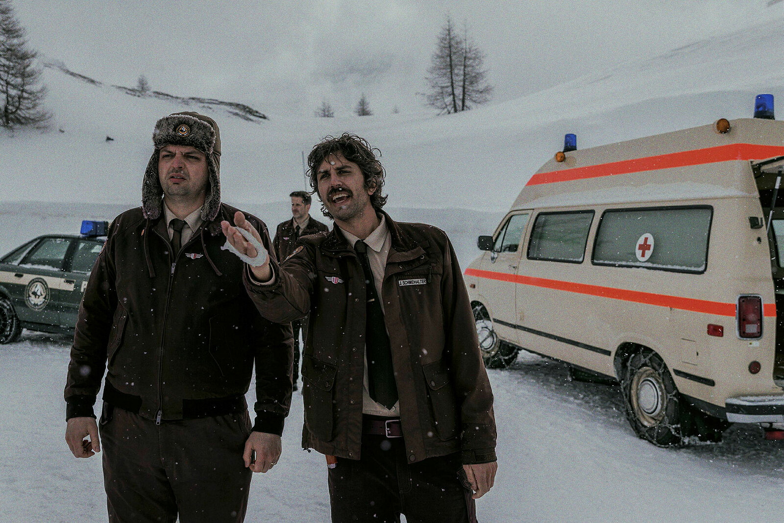RossgaglaTschugger Staffel 1 Shining Film AG Rafael Kistler Johannes Bachmann, Arnold B. Bucher, David Constantin, Rafael Kistler, Leandro Russo 2021 Folge 3 Hauptmotiv 4 Mike Müller als Luc Konrad (vorne) SRF/Dominic SteinmannBild: © SRF2