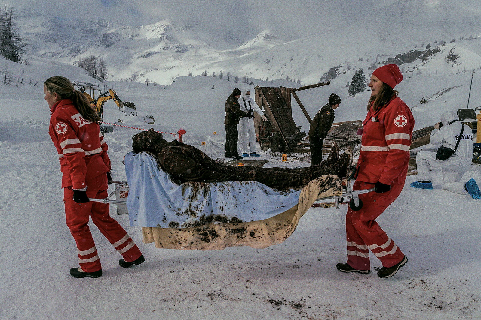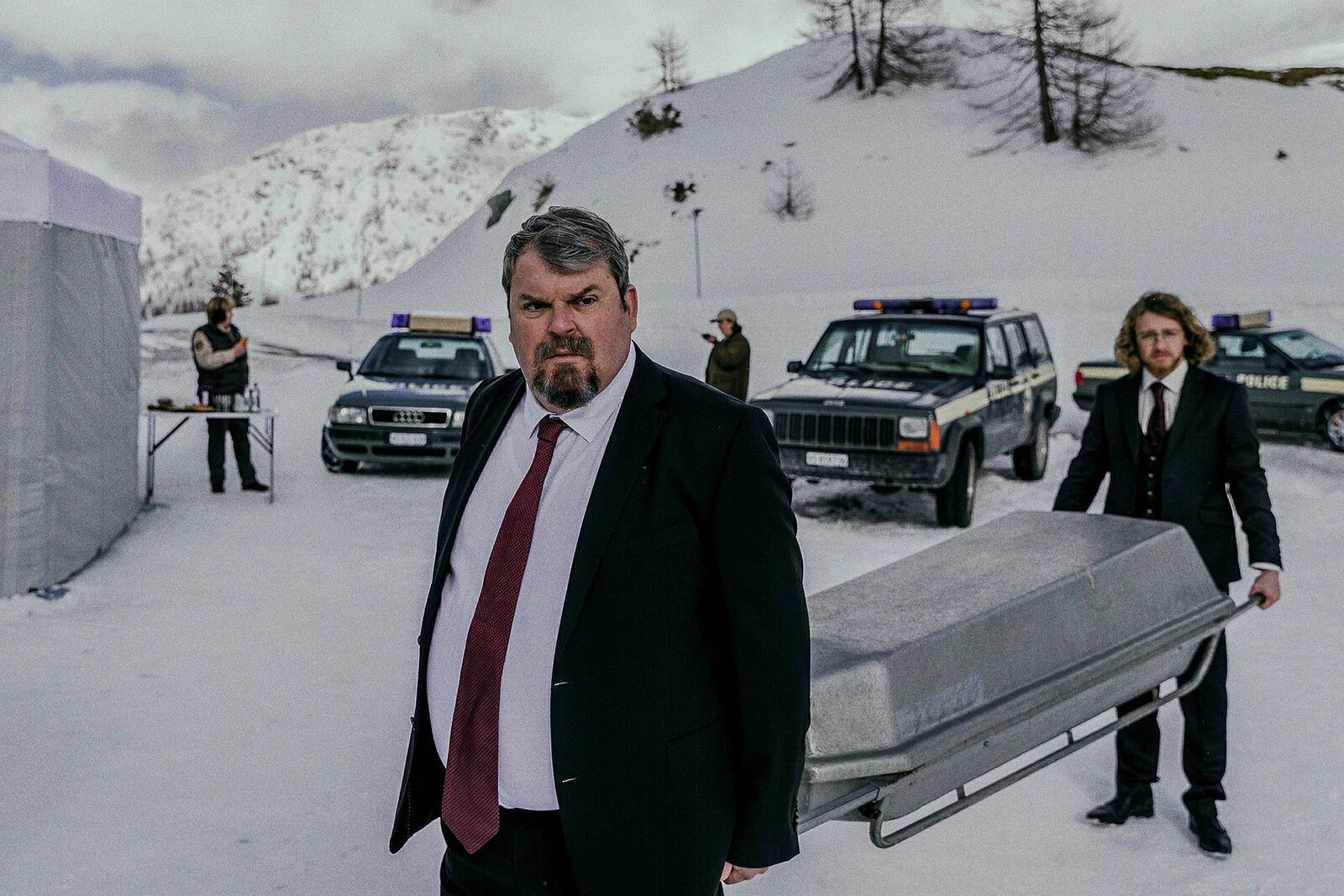 RossgaglaTschugger Staffel 1 Shining Film AG Rafael Kistler Johannes Bachmann, Arnold B. Bucher, David Constantin, Rafael Kistler, Leandro Russo, Mats Frey 2021 Folge 3 Hauptmotiv 3 Cedric Schild als Smetterling (auf der Bahre) SRF/Dominic SteinmannBild: © SRF2