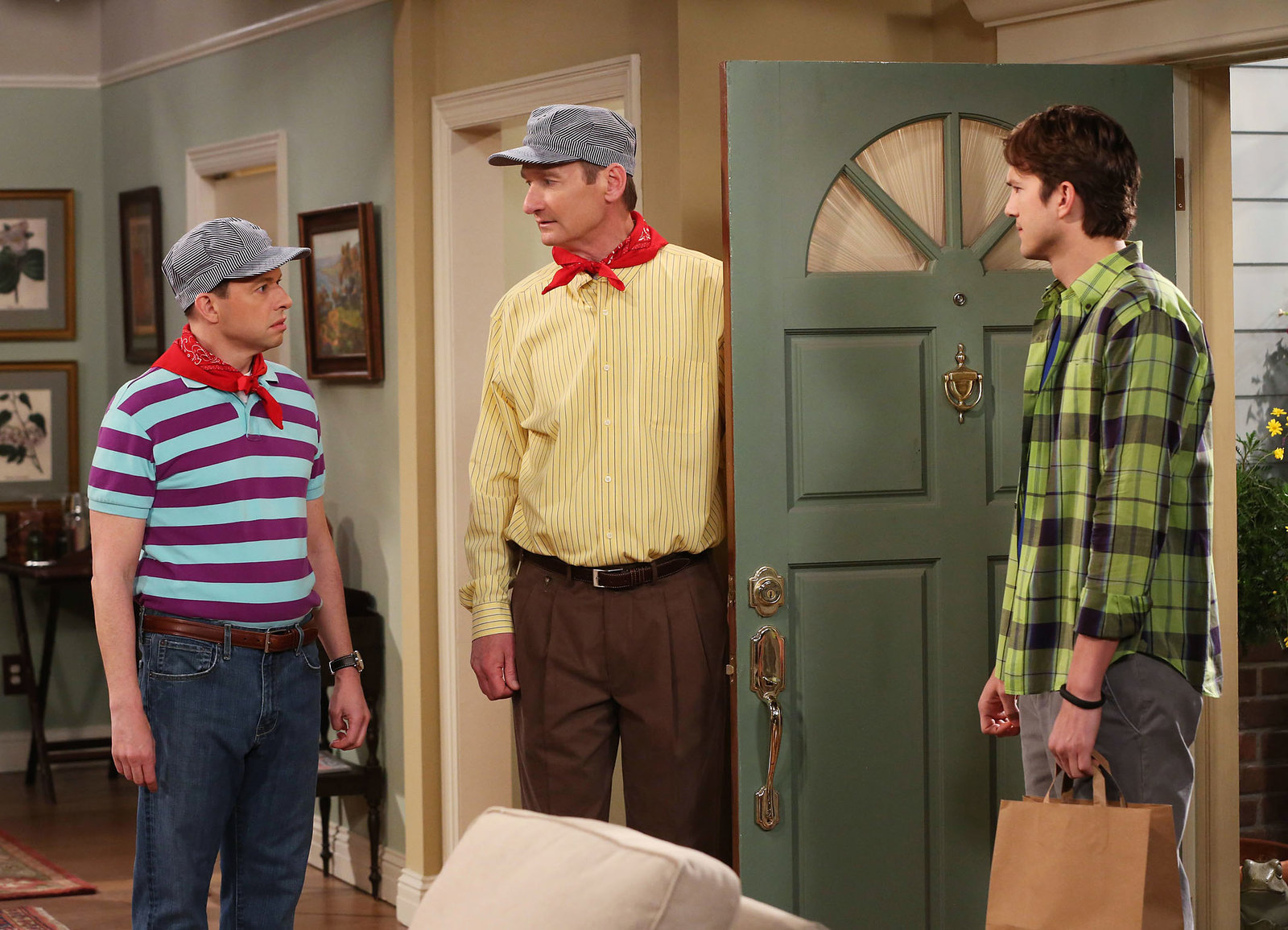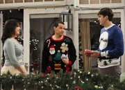 Hier kommt der WeihnachtsmannBesuch zur Weihnachtszeit: Melanie Lynskey als Rose, Jon Cryer als Alan Harper, Ashton Kutcher als Walden SchmidtBild: © Copyright SRF/Warner Bros.