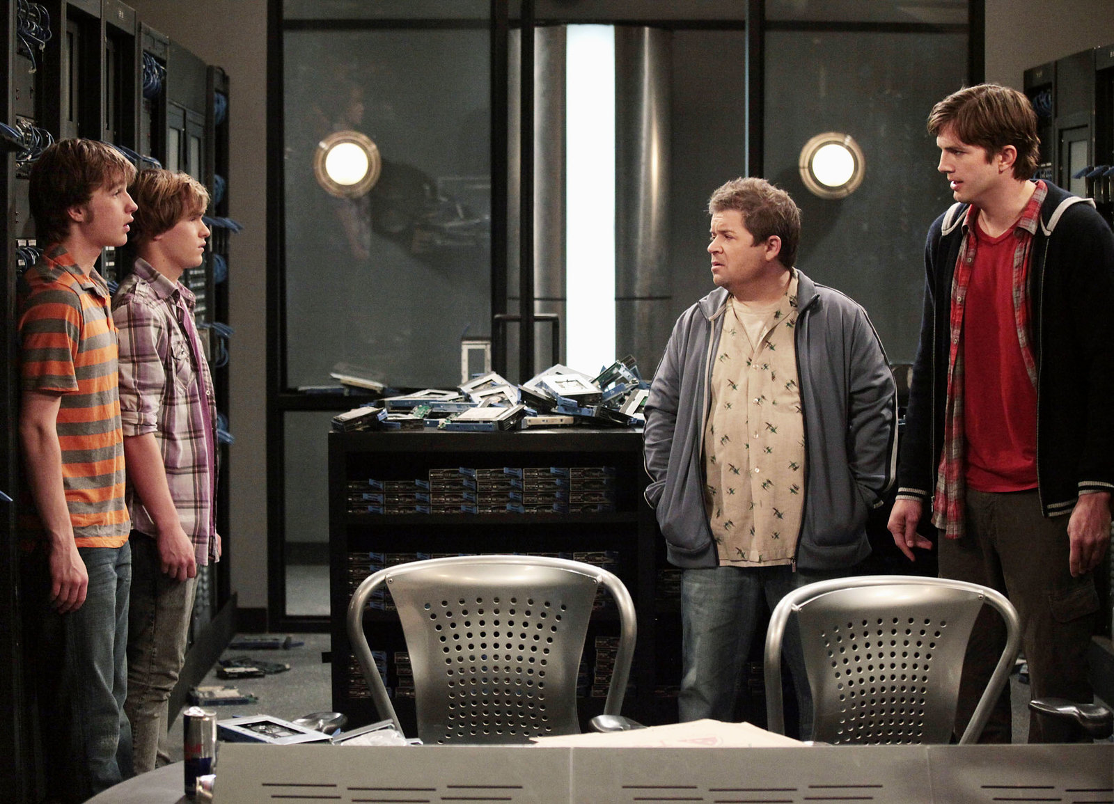 Die SuperchanceAls Arbeitskräfte unbrauchbar: Angus T. Jones als Jake Harper, Graham Patrick Martin als Eldridge Mackelroy, Patton Oswalt als Billy Stanhope, Ashton Kutcher als Walden SchmidtBild: © SRF/Warner Bros.