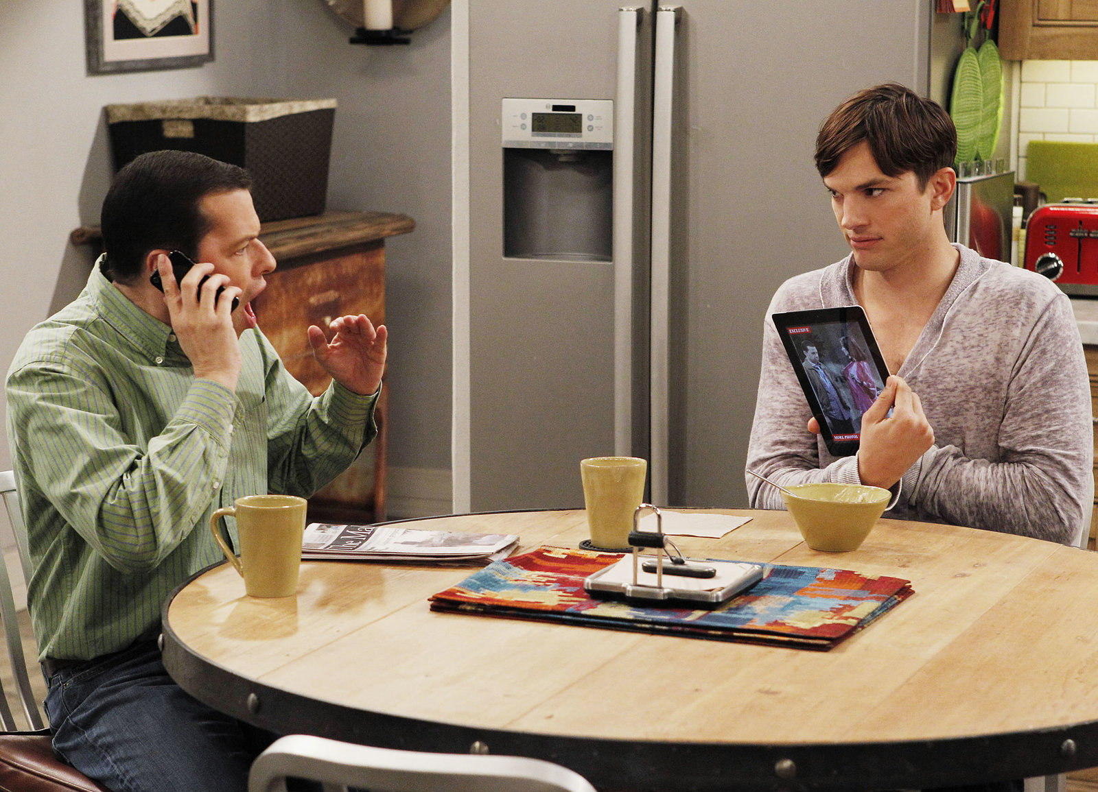 Die Paparazzi-FalleVerräterische Schlagzeilen: Jon Cryer als Alan Harper, Ashton Kutcher als Walden SchmidtBild: © SRF/Warner Bros.