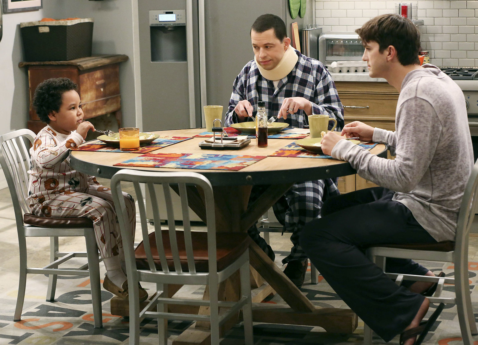 Mütter an der KletterwandFrühstück mit Nackenstarre: Edan Alexander als Louis, Jon Cryer als Alan Harper, Ashton Kutcher als Walden SchmidtBild: © SRF/Warner Bros.