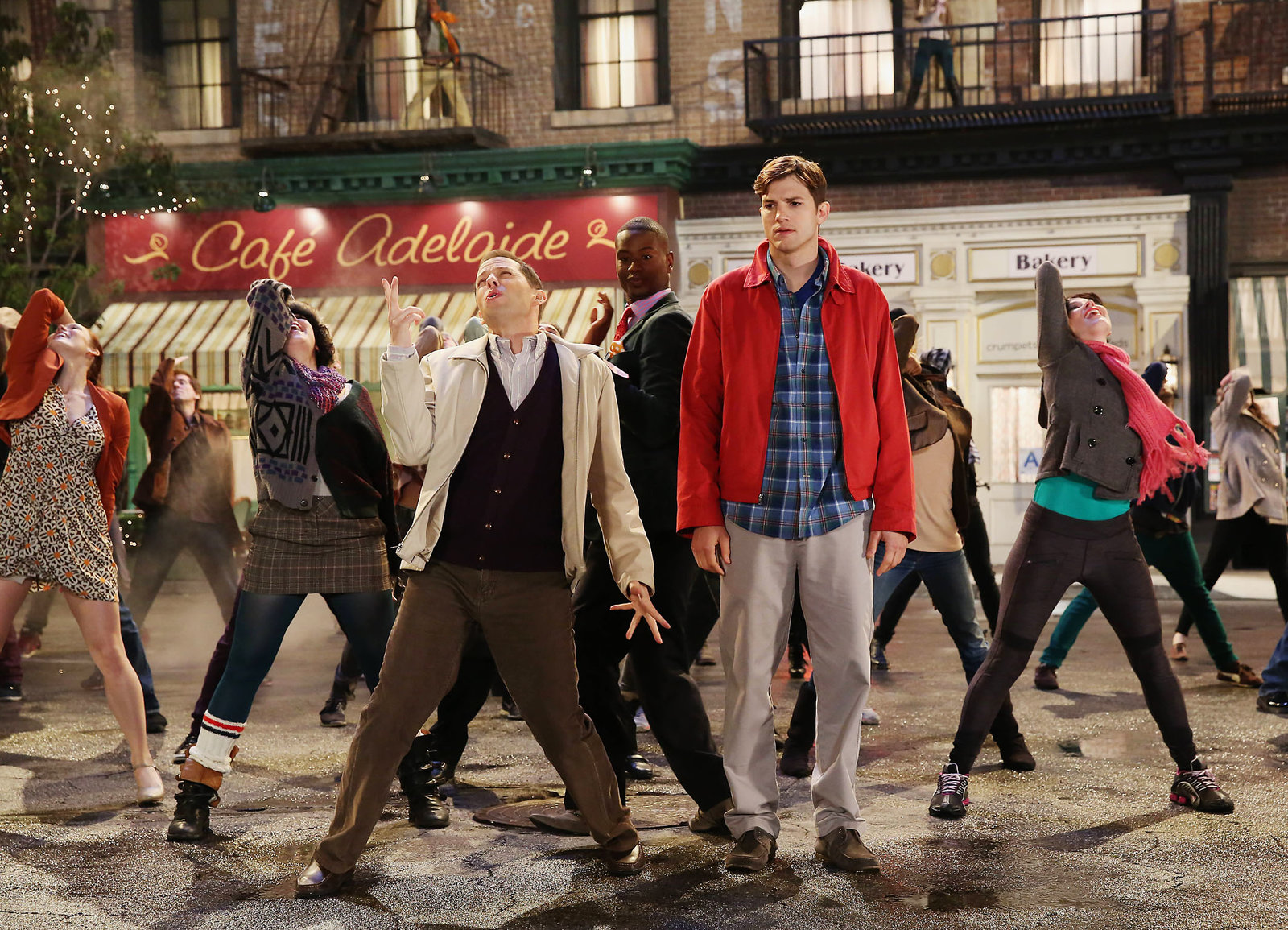 Das Leben ist kein MusicalPlötzlich Musicalstar: Jon Cryer als Alan Harper (vorne l.) und Ashton Kutcher als Walden Schmidt (vorne r.)Bild: © SRF/Warner Bros.