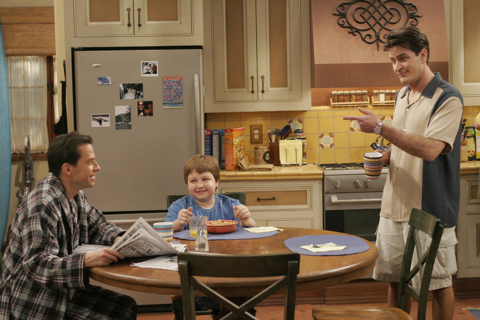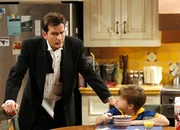 Ich brauche BertaWährend Alan versucht Berta für den Haushalt zurückzugewinnen, soll Charlie (Charlie Sheen, r.) dafür Sorge tragen, dass Jake (Angust T. Jones, l.) ordentlich angezogen ist, wenn er von seiner Mutter abgeholt wird ...Bild: © Warner Brothers Entertainment Inc. Lizenzbild frei