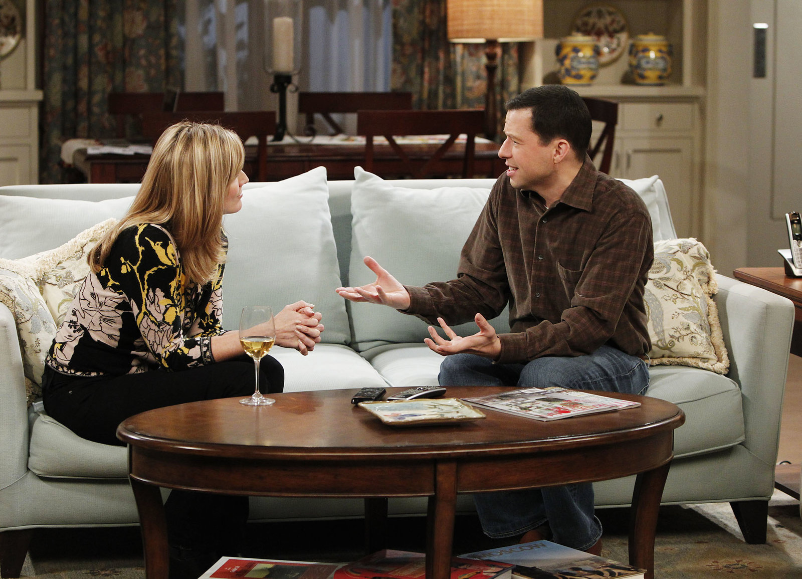Nicht in meinen Mund!Als Süffel verdächtigt: Courtney Thorne-Smith als Lyndsey Mackelroy, Jon Cryer als Alan HarperBild: © SRF/Warner Bros.